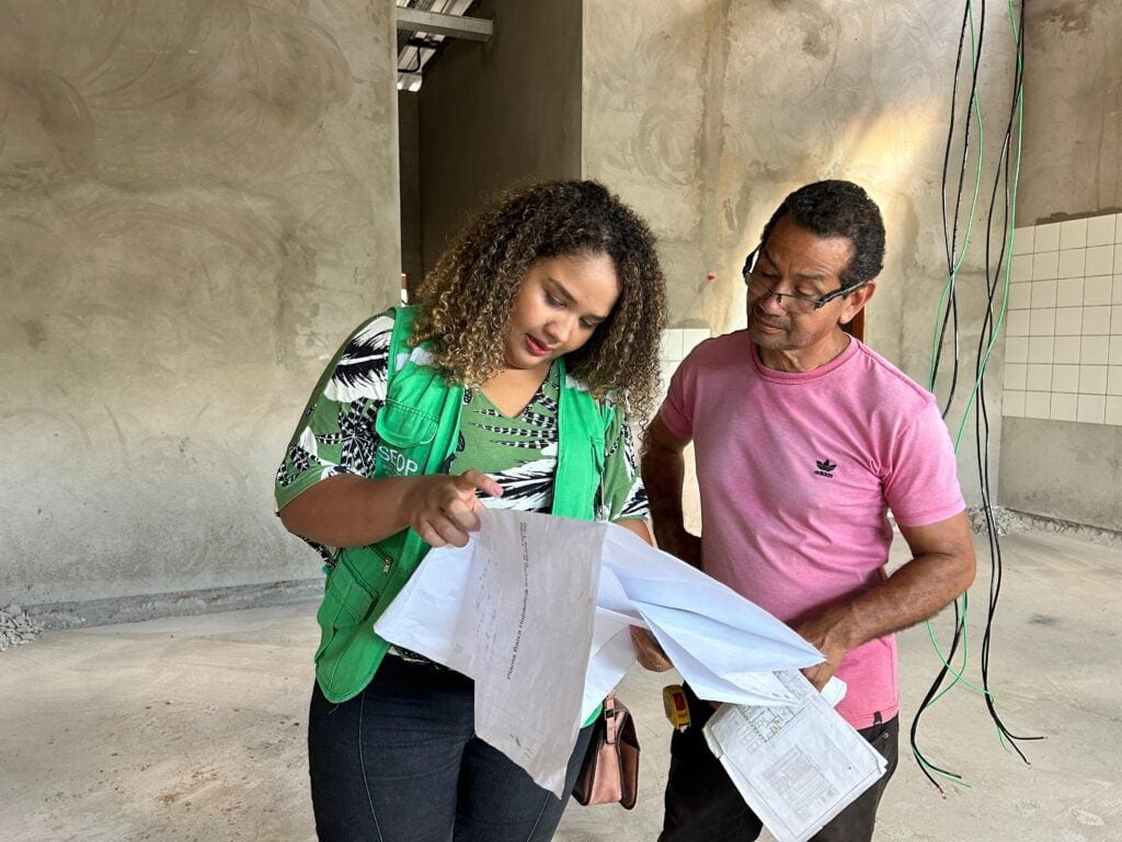 Fiscal da Seop observa projeto e fiscaliza obra. Foto: Camila Gomes
