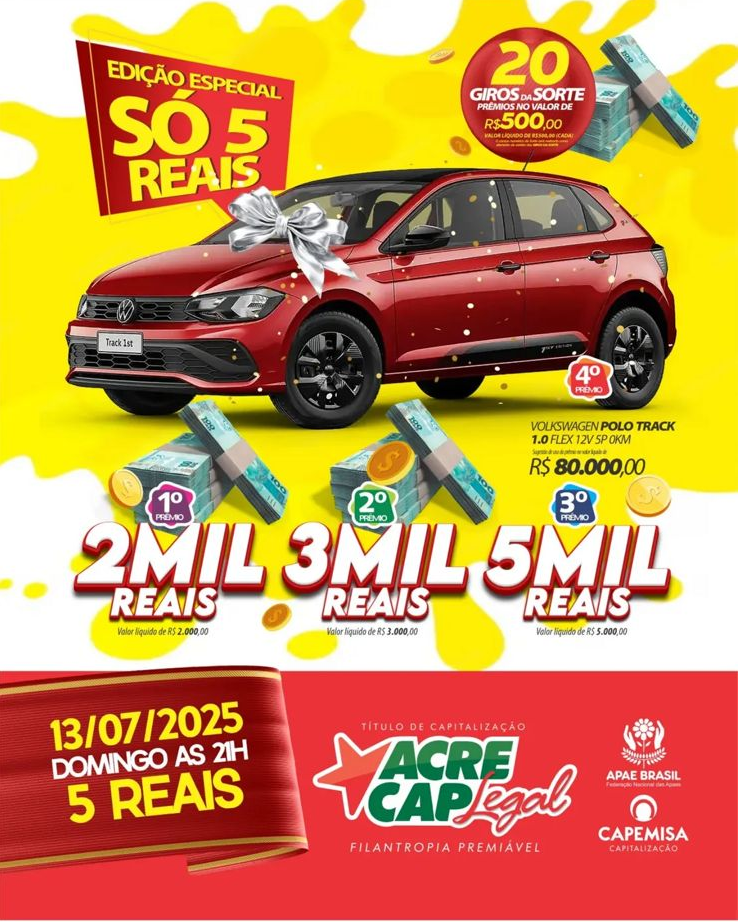 O Acre Cap Legal realiza no próximo domingo, 13 de julho de 2025, às 21h, um grande sorteio de prêmios que inclui valores em dinheiro de R$ 2 mil a R$ 5 mil, além de um carro Volkswagen Polo Track 0 km avaliado em R$ 80 mil. O título de capitalização custa apenas R$ 5.