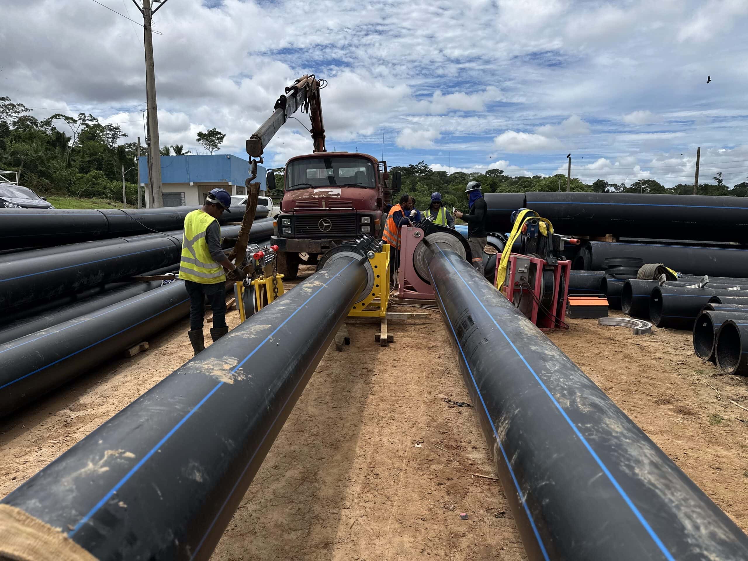 A soldagem das novas tubulações está sendo realizada por uma equipe técnica contratada de fora do estado, especializada nesse tipo de procedimento. O serviço é feito por termofusão, uma técnica que utiliza calor para unir as extremidades dos tubos de forma permanente, criando conexões seguras e resistentes à pressão. Esse tipo de solda requer equipamentos específicos e operadores capacitados, já que qualquer falha pode comprometer o sistema de captação e o fornecimento de água para a população.