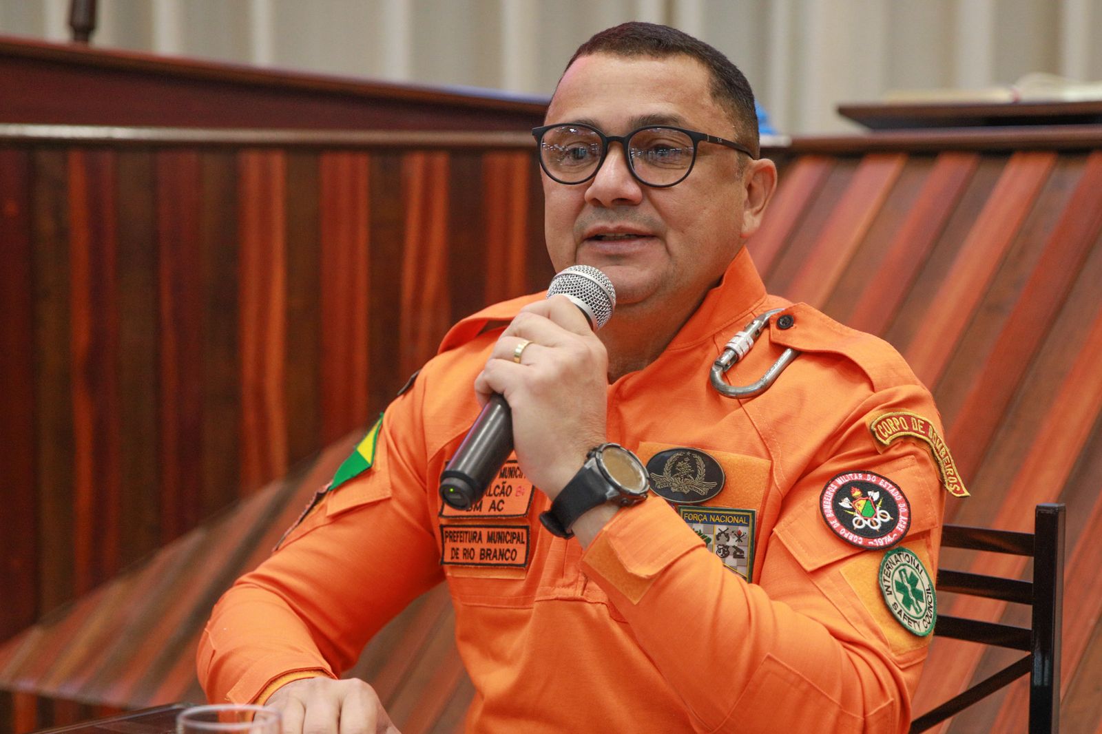 Em seguida, o Tenente-coronel Cláudio Falcão, coordenador da Defesa Civil Municipal de Rio Branco, destacou que a atuação do órgão deve se basear em cinco pilares: prevenção, preparação, mitigação, socorro e restabelecimento, mas lamentou que, no Brasil, a maioria das 5.700 Defesas Civis municipais atue apenas nas etapas finais, deixando de lado ações preventivas. Ele frisou que a Defesa Civil da capital, criada por lei em 2012, ainda é recente, e que as secas e estiagens, além de afetarem 100% da população, geram prejuízos econômicos muito maiores que as inundações, embora estas últimas causem mais mortes.