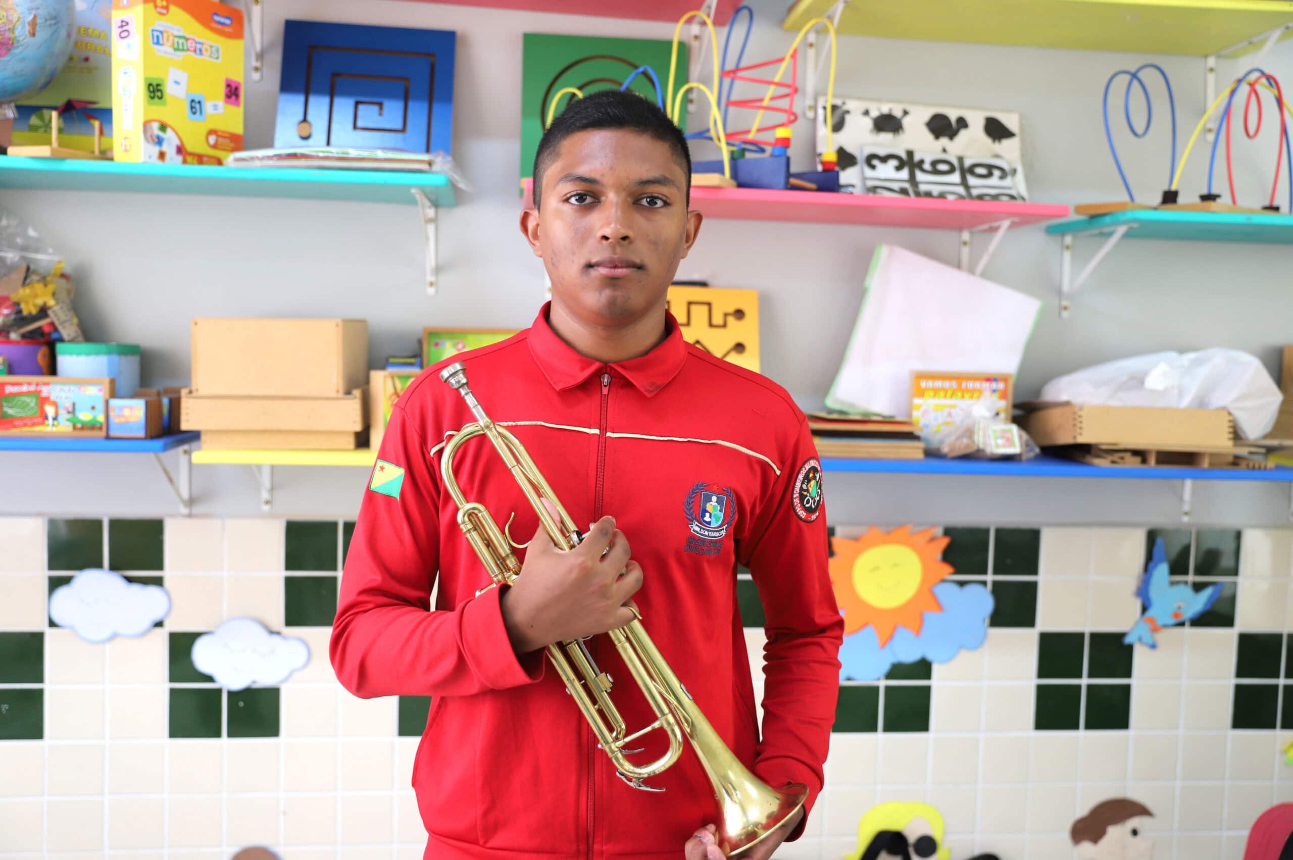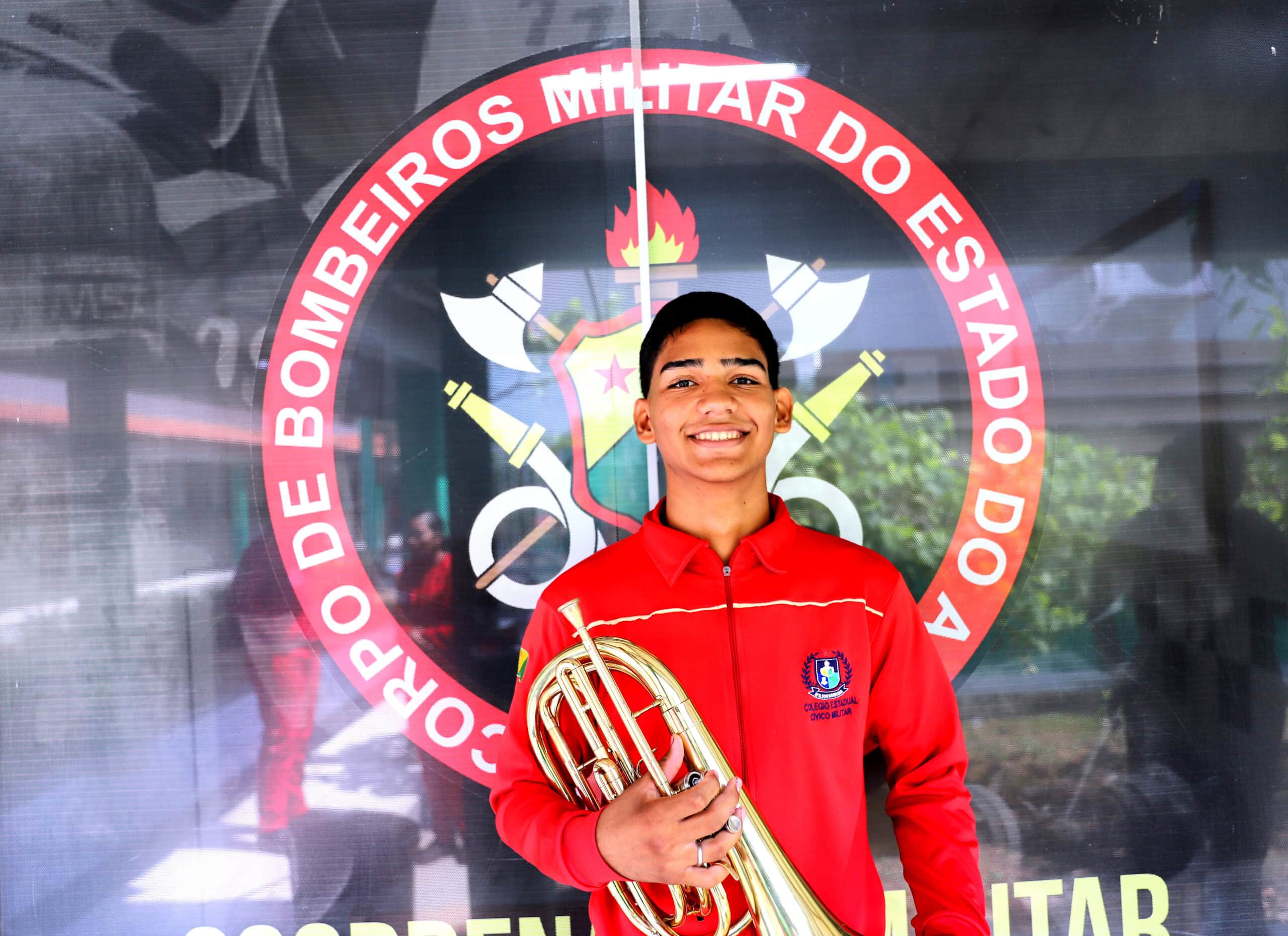 “Quando eu entrei na banda, foi uma indicação da coordenadora do AEE [Atendimento Educacional Especializado], que falou para o maestro ver se eu conseguia tocar. Ele me deu o instrumento, pediu para eu soprar e deu certo. Desde então, nunca mais larguei. É a única trompa da banda e eu gosto muito dela. A música mudou meu jeito de ser. Antes eu era calado; tinha vergonha de conversar, agora perdi o medo, interajo mais e estou bem melhor”, contou, emocionado, David Kauã Ramos, de 16 anos.