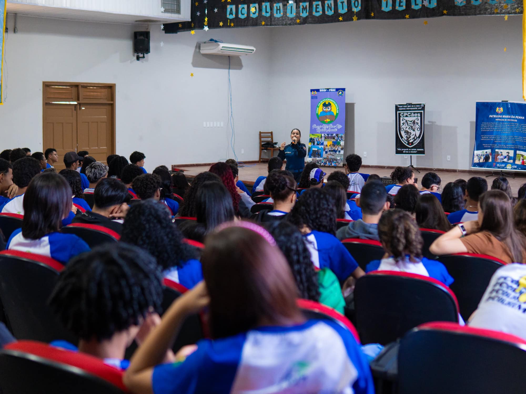 A tenente-coronel Ana Cássia Monteiro explica que a Polícia Militar do Acre tem um programa de Polícia Comunitária. Esse programa congrega várias ações voltadas para fortalecer a relação da polícia militar com a comunidade, bem como a segurança nos locais em que trabalham. E a PMAC na escola é um projeto voltado especificamente para a comunidade escolar, com o objetivo de prevenir delitos de toda a natureza dentro das escolas, focando exatamente na atuação precisa da polícia militar.