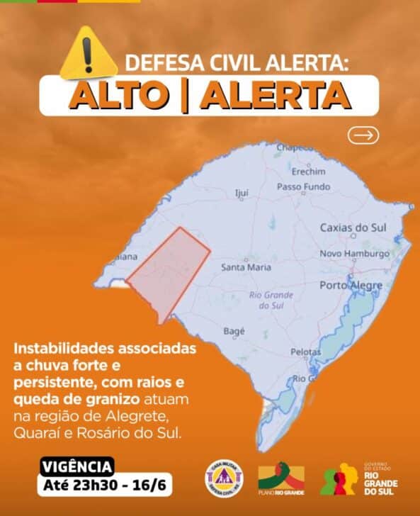 A Defesa Civil do Rio Grande do Sul emitiu, na noite de 16 de junho de 2025, um alerta para chuvas fortes e persistentes, acompanhadas de raios e possibilidade de queda de granizo, nas cidades de Alegrete, Quaraí e Rosário do Sul, na região da Fronteira Oeste. O aviso, válido até 23h30, destaca o risco elevado de alagamentos e orienta a população a evitar áreas de risco, com emergência atendida pelos números 190 e 193. A medida responde às instabilidades climáticas que intensificam temporais na região, agravando preocupações com segurança e infraestrutura local.
