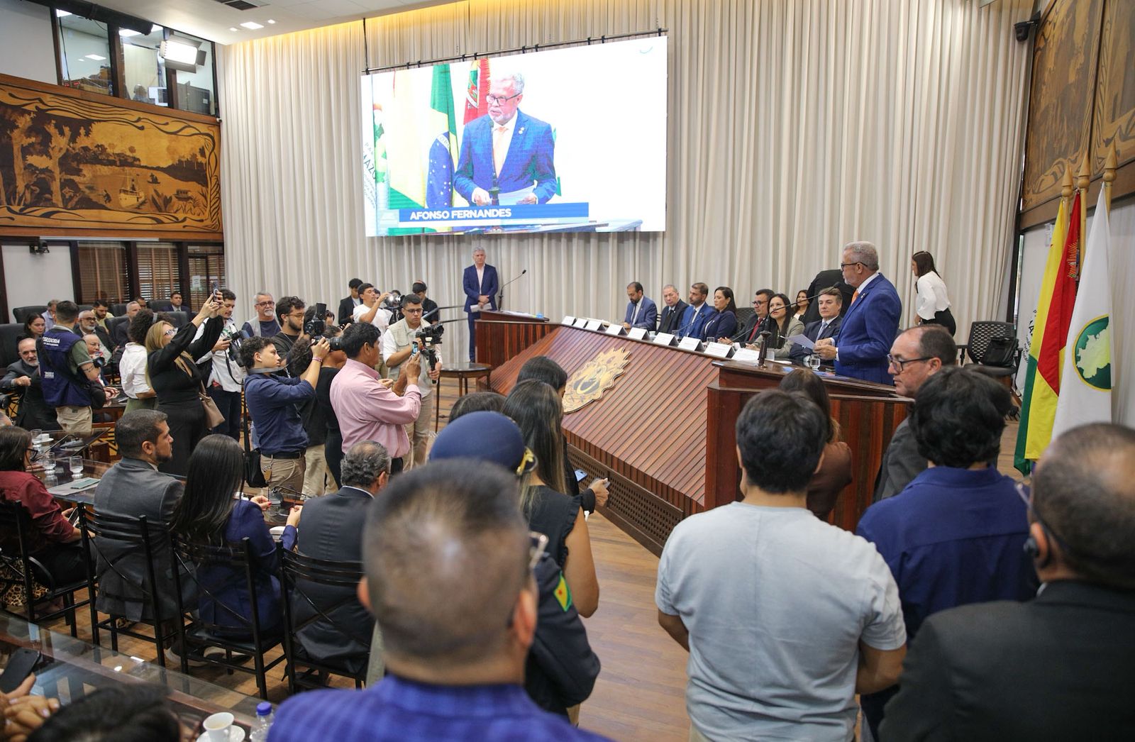 A Assembleia Legislativa do Acre (Aleac), foi palco na manhã desta quarta-feira (25), da solenidade de posse da Mesa Diretora do Parlamento Amazônico – 2026/2027. Na ocasião, o deputado Afonso Fernandes (Solidariedade), assumiu a presidência do colegiado, instituição política, criada há 20 anos que reúne nove Assembleias Legislativas dos Estados que compõem a Amazônia Legal Brasileira: Amazonas, Acre, Amapá, Roraima, Rondônia, Mato Grosso, Pará, Maranhão e Tocantins.