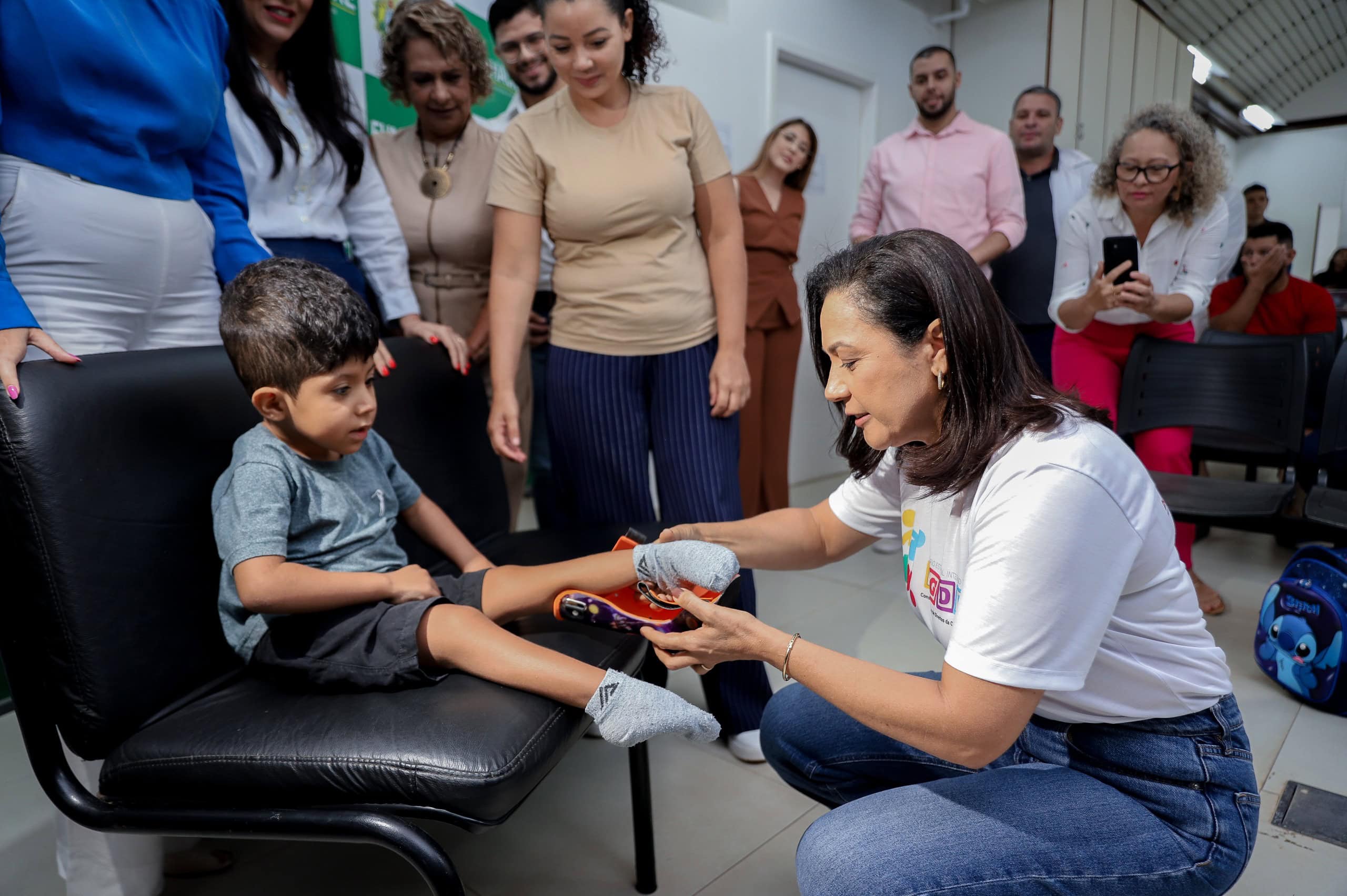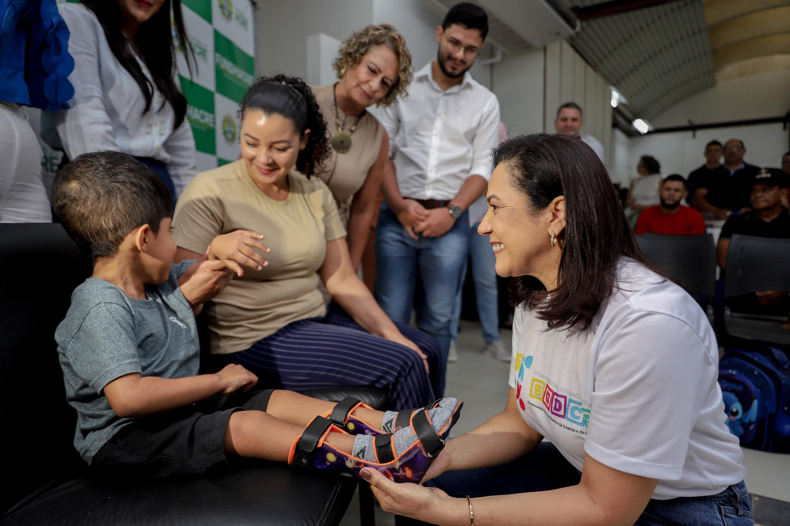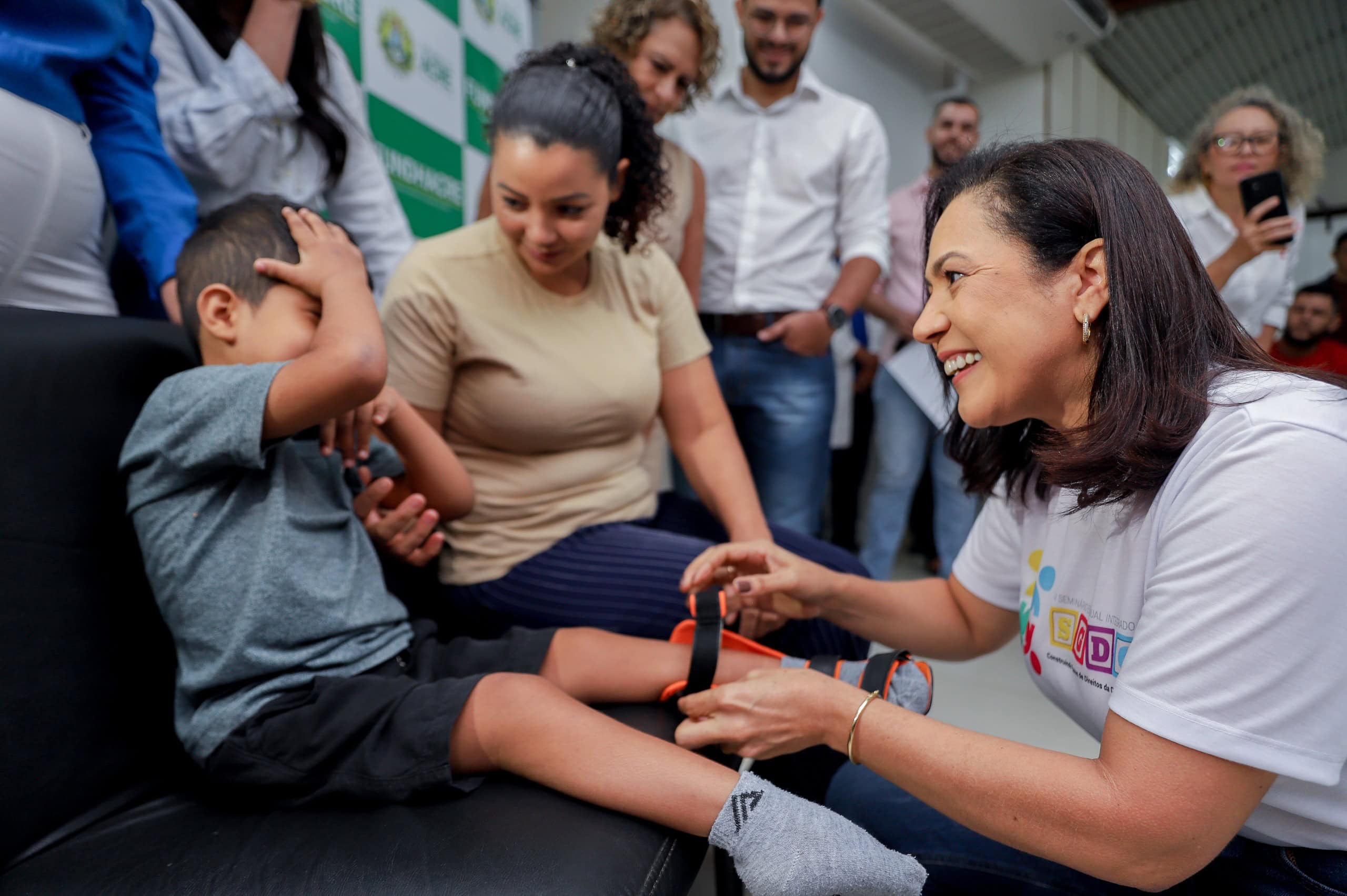 Elciane Fernandes, mãe de Elias, afirma que as órteses vão auxiliar a criança no tratamento: “Vai melhorar muito, porque vai ajudar a manter o pé dele no lugar, para não entortar e atrofiar mais”.