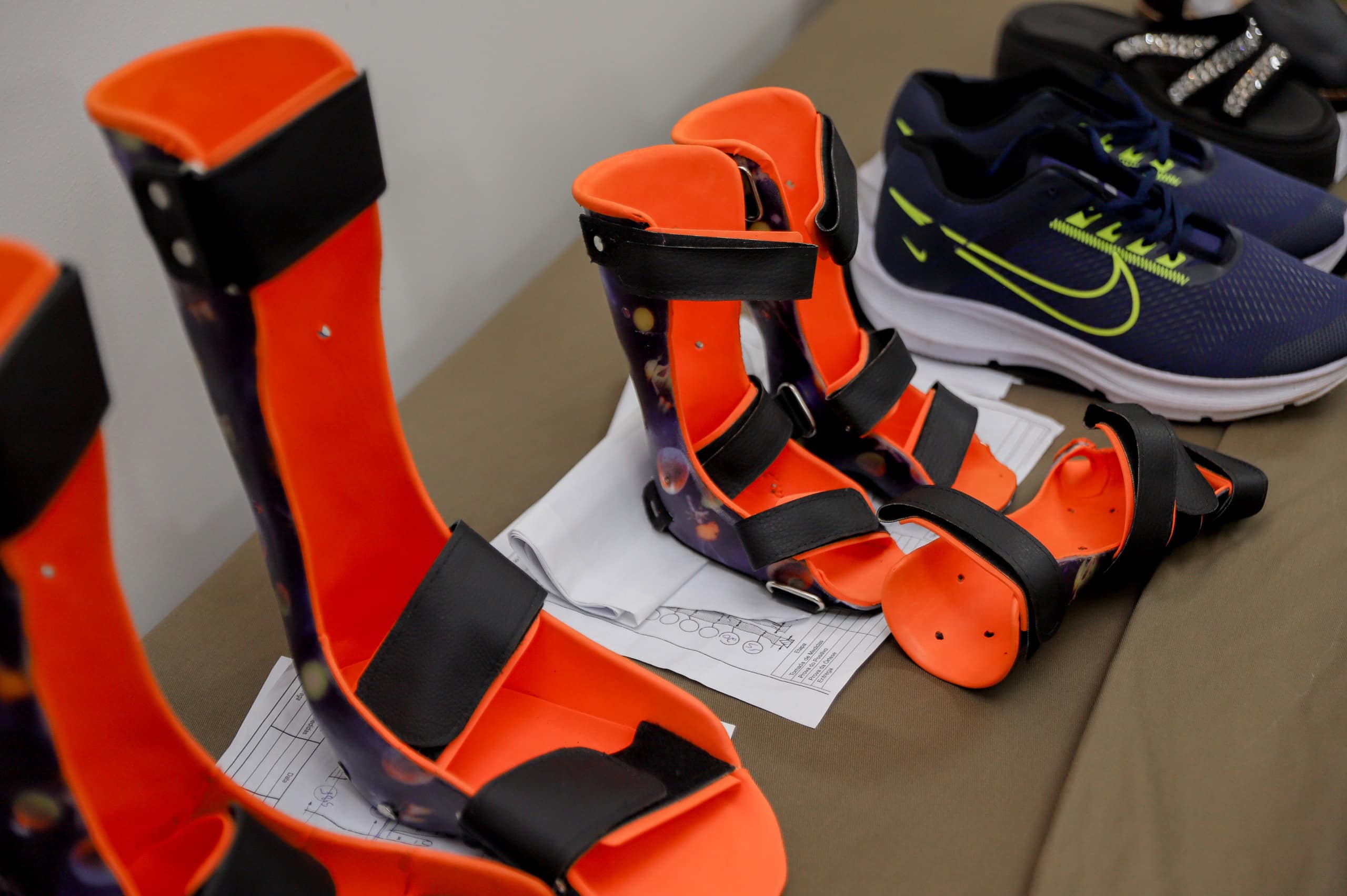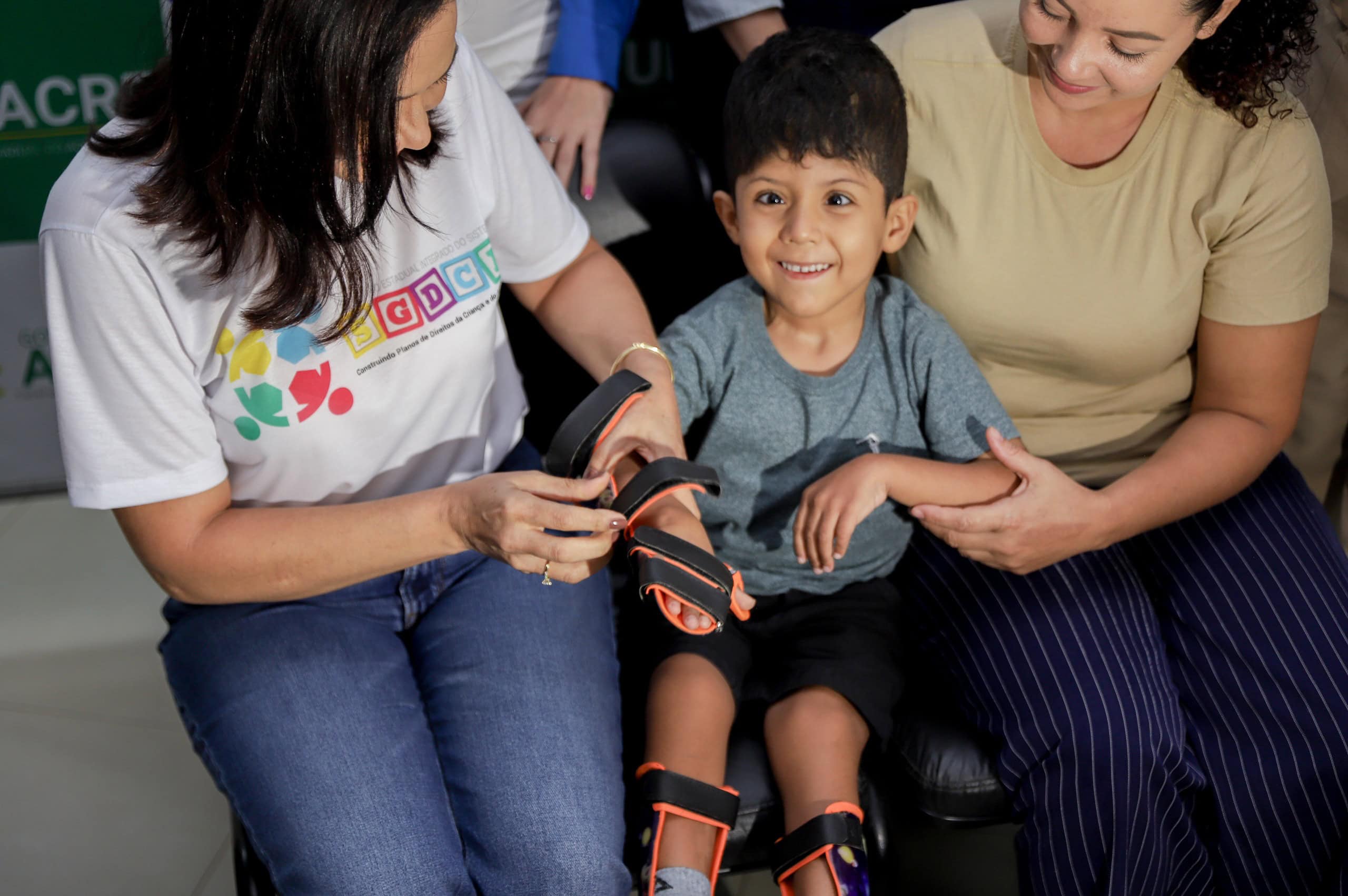 Elias Menezes, de 6 anos, representou os pacientes, ao receber uma órtese para extensão de punho e polegar direito e órtese suropodálica sem articulação bilateral, colocados em sua mão e pés por Mailza. Outros dez pacientes também fazem parte do grupo que receberão dispositivos, de acordo com sua necessidade clínica.