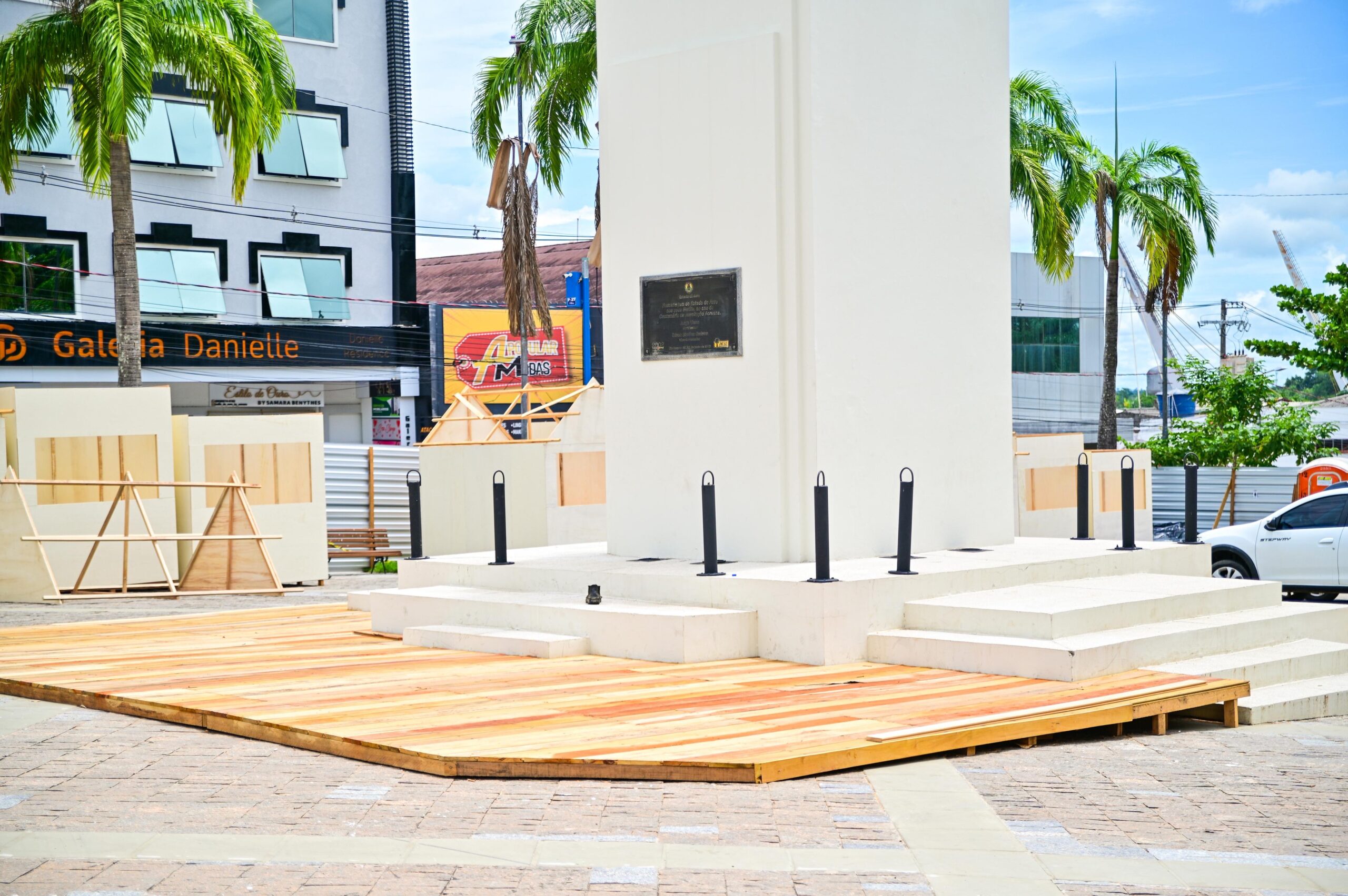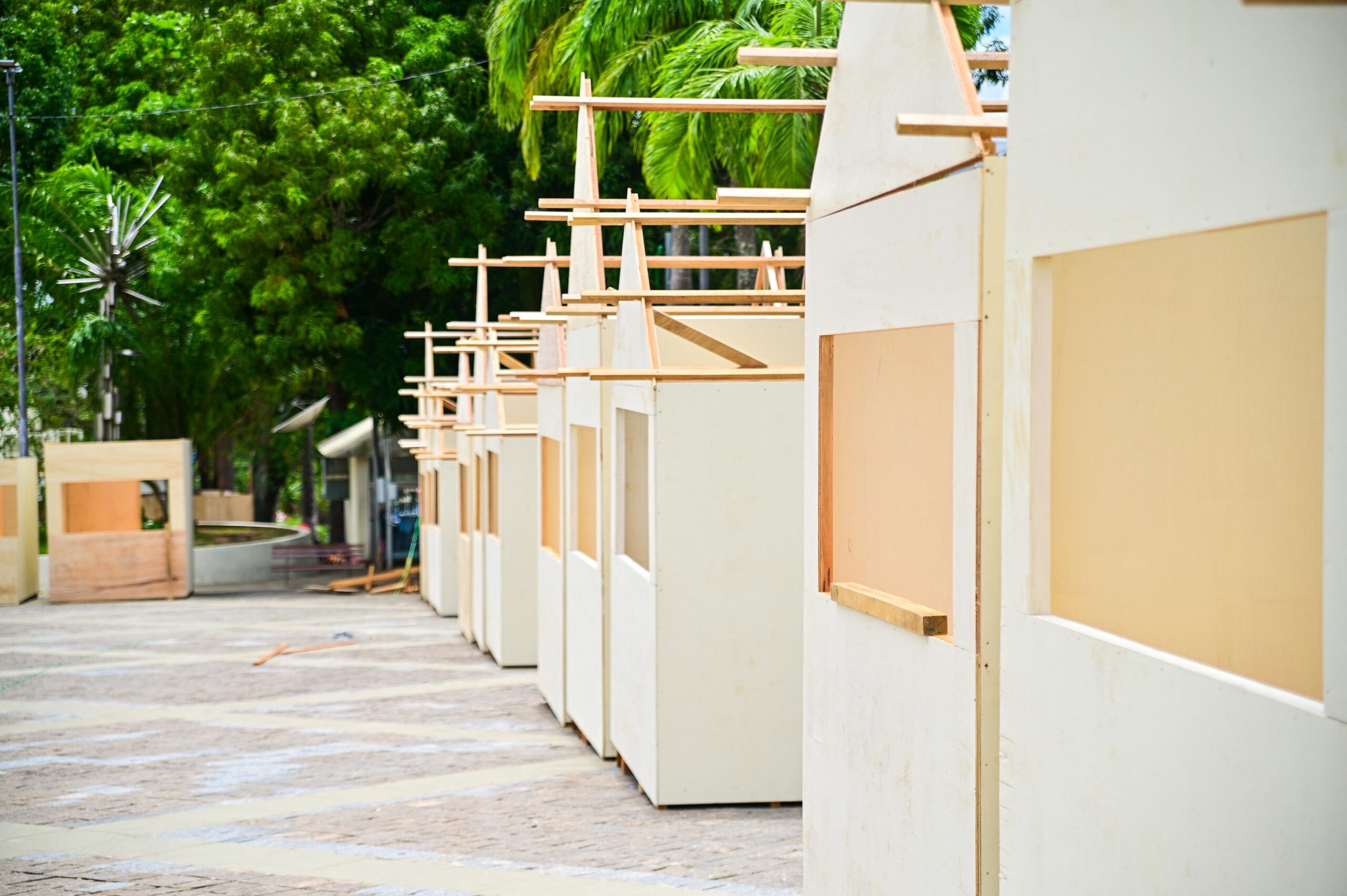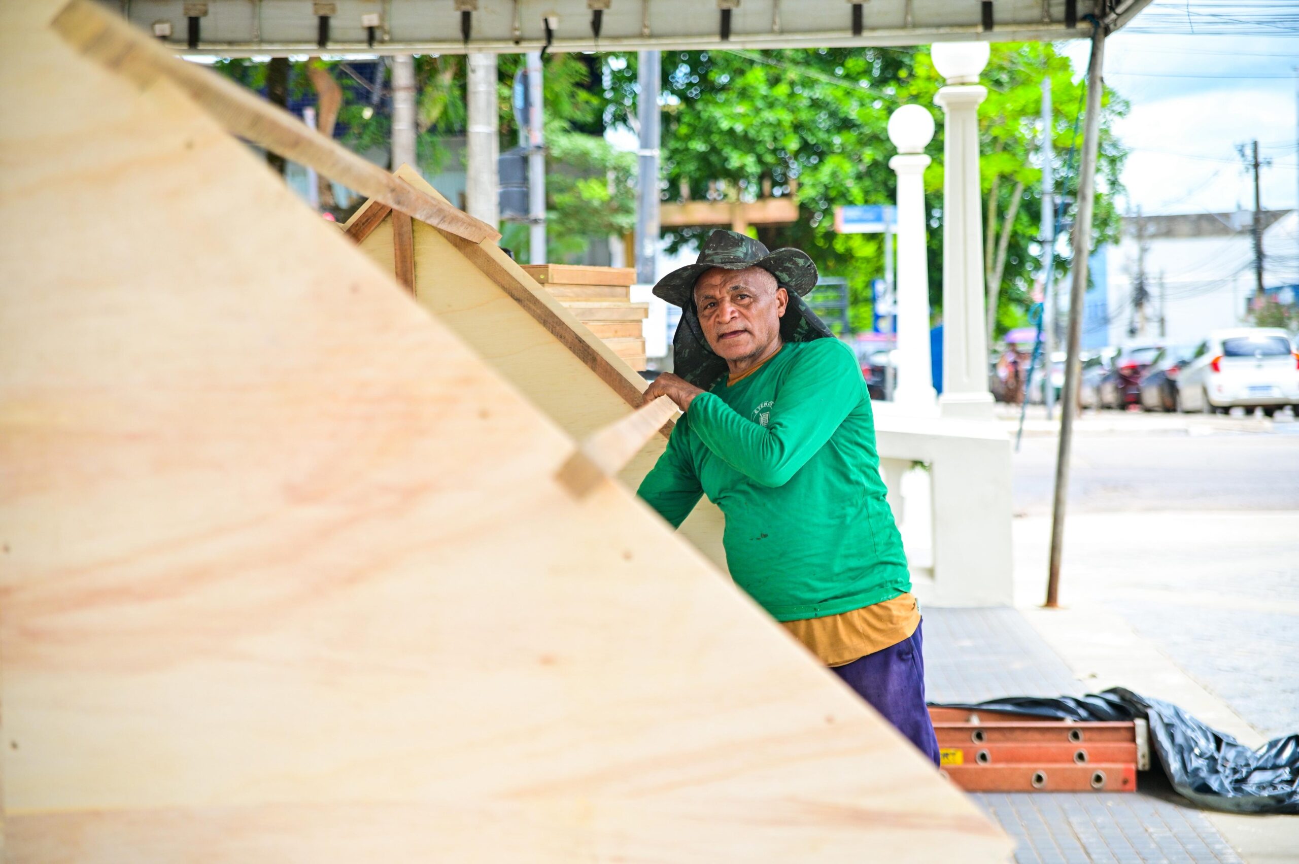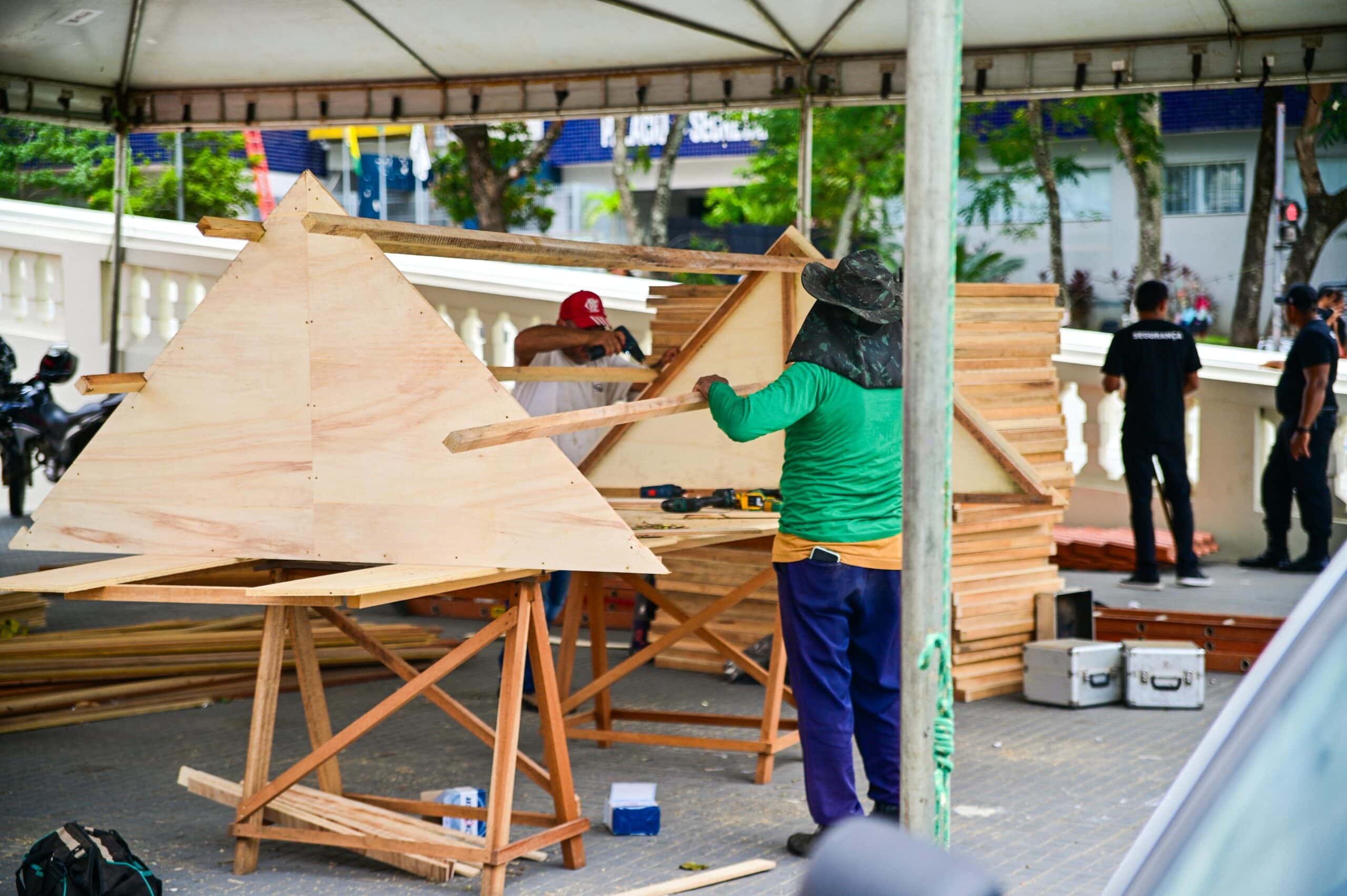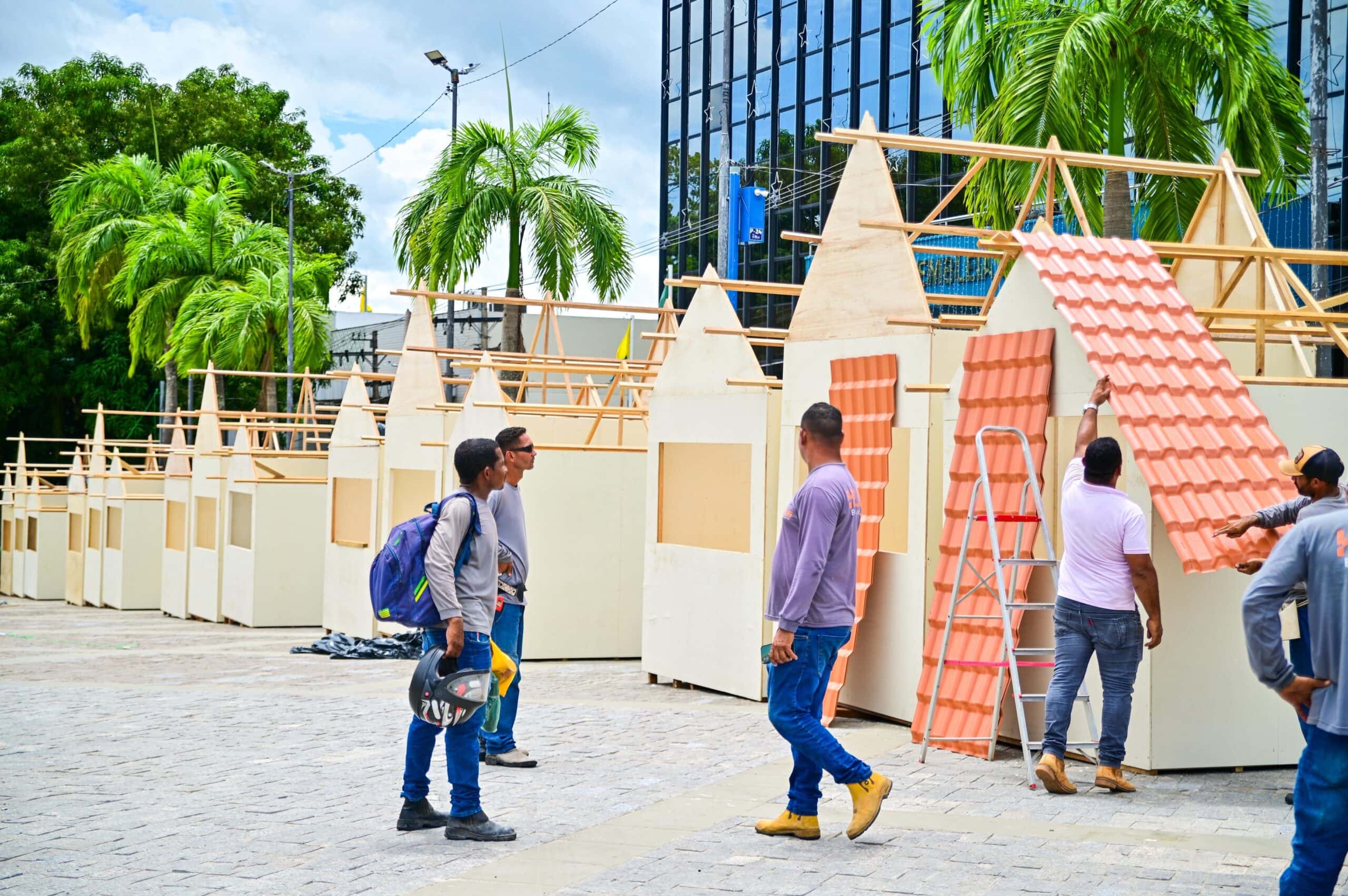 Feira natalina está sendo montada em frente ao Palácio Rio Branco. Foto: Ingrid Kelly/SecomAlém disso, a feira da economia solidária também estará presente, oferecendo produtos artesanais e valorizando o trabalho de empreendedores locais. Para a criançada, brinquedos infláveis estarão disponíveis todas as noites, garantindo diversão em meio ao ambiente iluminado e repleto de magia.