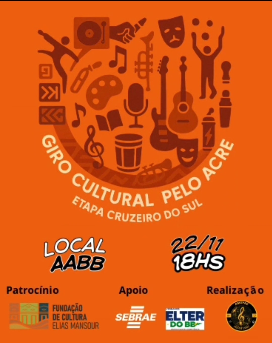 O Giro Cultural pelo Acre chega a Cruzeiro do Sul neste sábado, 22, com programação a partir das 18h, na sede da AABB. Idealizado pela Associação dos Músicos e Produtores Independentes do Acre (Amupac), o projeto é financiado pelo governo do Estado, por meio do Fundo Estadual de Cultura (Funcultura), gerido pela Fundação de Cultura Elias Mansour (FEM). Somente este ano, o Funcultura destinou R$ 2,4 milhões a cinco linhas de fomento: Arte e Patrimônio; Fortalecimento dos Povos Originários; Prêmio Mestres da Cultura; Entidades Representativas; e Iniciantes.