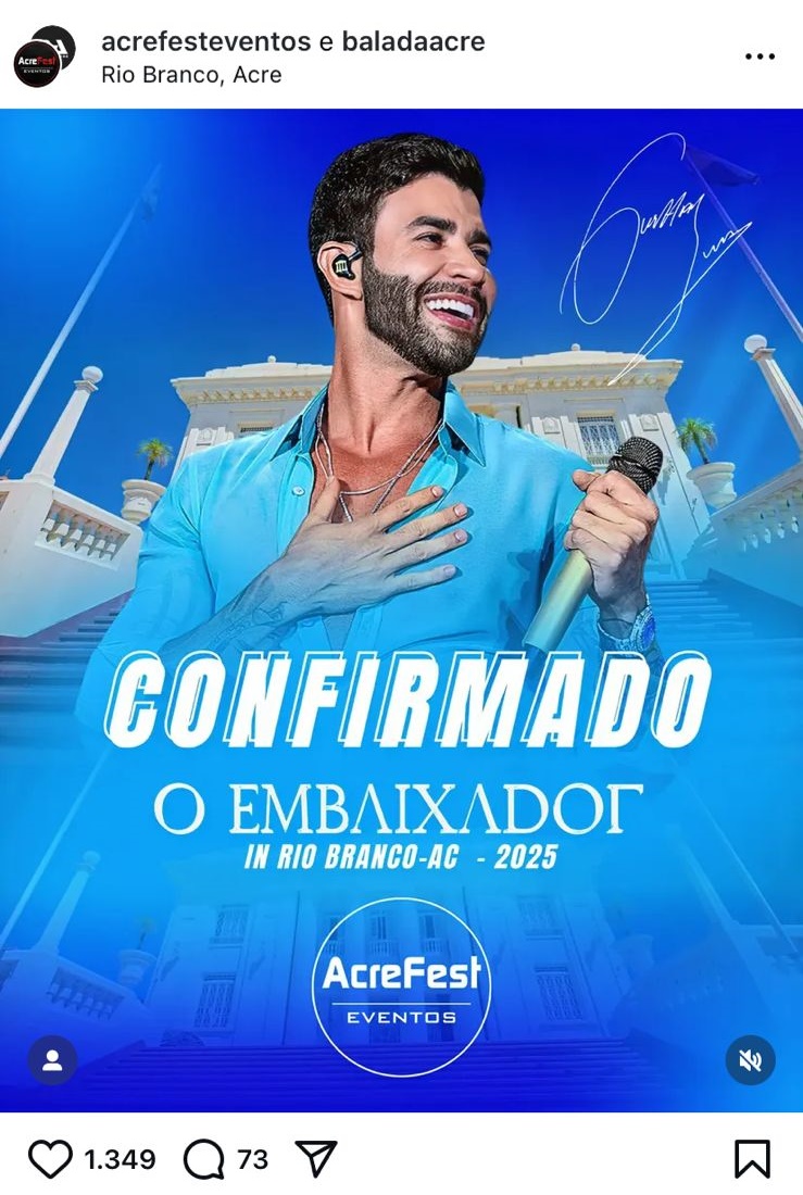 O cantor Gusttavo Lima fará show em Rio Branco ainda em 2025. A informação foi divulgada pelo perfil Acrefestevento, página do Instagram responsável por coberturas de shows e demais eventos de entretenimento na capital acreana.