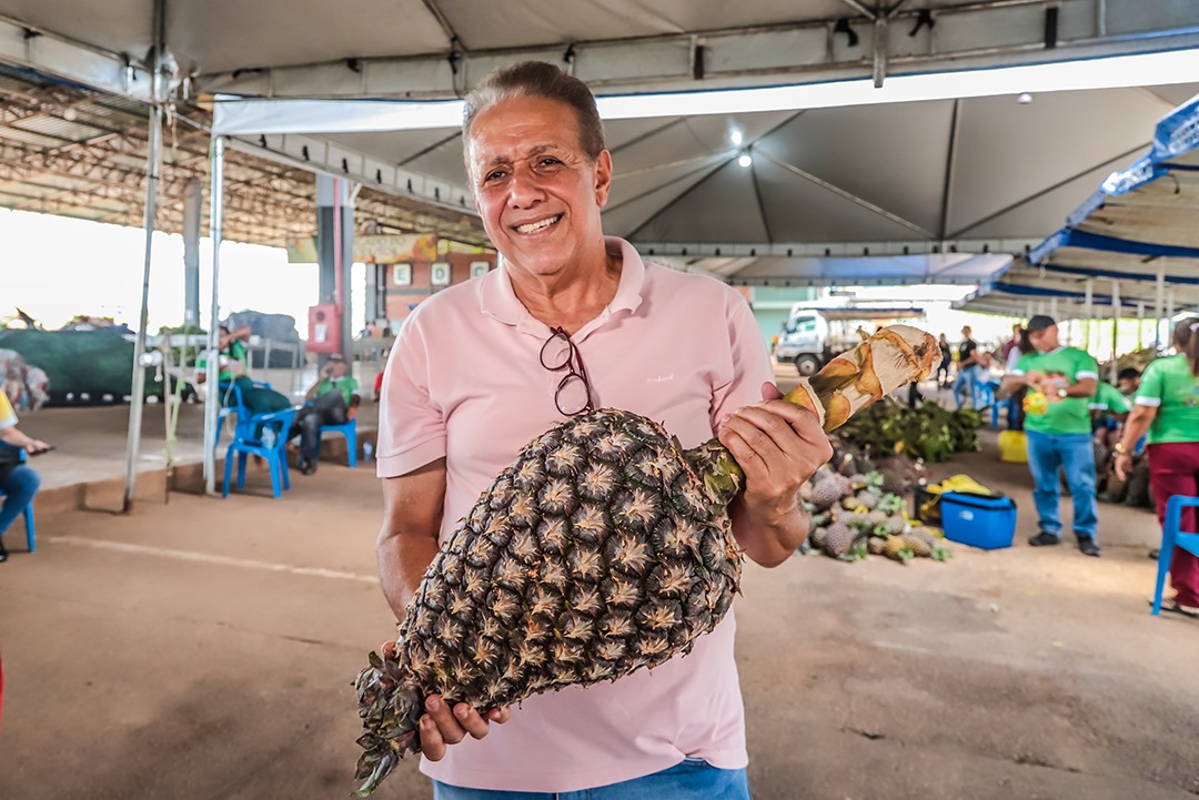 É o nosso abacaxi gigante, o abacaxi de Tarauacá — a terra do abacaxi grande e da mulher bonita”, celebrou Rodrigues. (Foto: Val Fernandes/Secom)