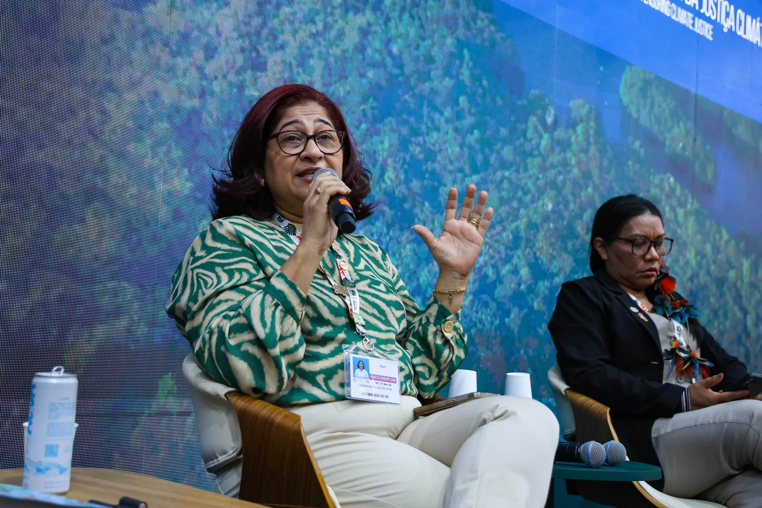 A superintendente de Gestão de Políticas Públicas Ambientais das Secretaria do Meio Ambiente e Recursos Hídricos do Tocantins, Marli Santos, moderou o painel e convidou a presidente do IMC, Jaksilande Araújo, para falar dos desafios no processo de atualização da nova repartição de benefícios do Programa de REDD+ Jurisdicional do Acre, o Isa Carbono, do Sistema de Incentivo a Serviços Ambientais (Sisa).