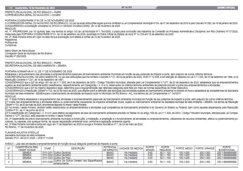 A partir do dia 1º de dezembro, começam a valer as novas regras para o licenciamento ambiental em Rio Branco. O Decreto Municipal, publicado pela Prefeitura, estabelece o enquadramento das atividades e empreendimentos que passam a ser obrigados a se adequar às novas normativas. O objetivo é garantir que construções e usos com potencial de impacto ambiental sigam critérios técnicos atualizados, prevenindo danos ao meio ambiente e evitando prejuízos futuros aos próprios empreendedores.