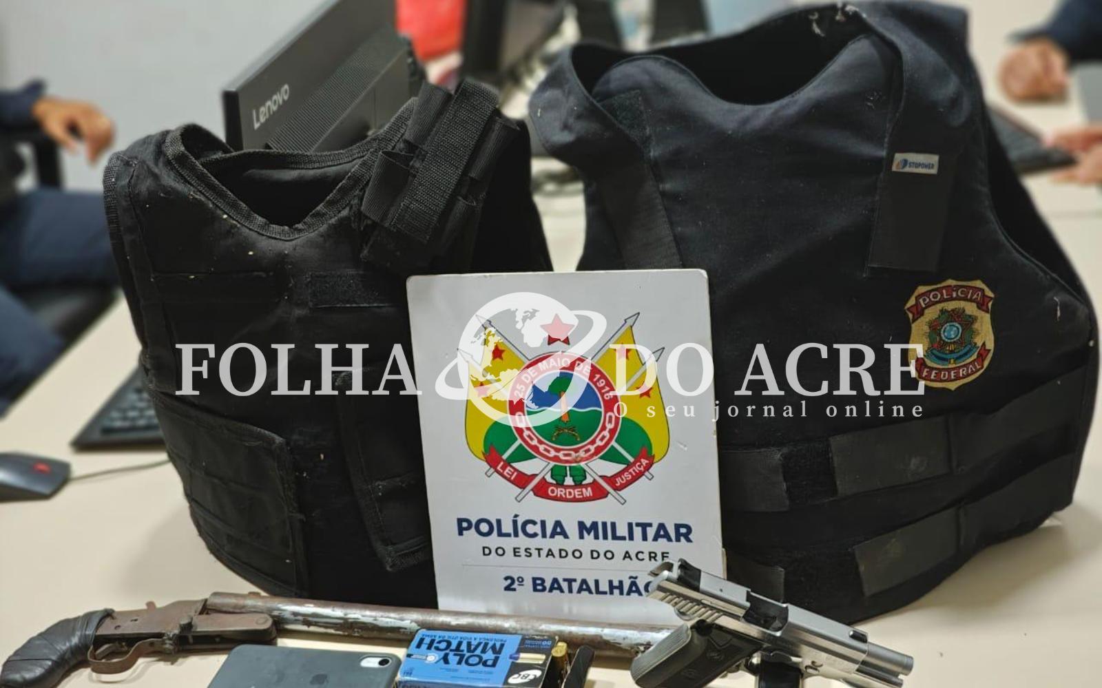 Durante patrulhamento na tarde desta sexta feira (27), no Conjunto Habitacional Cidade do Povo, no Segundo Distrito de Rio Branco, a Polícia Militar conseguiu prender dois homens em posse de arma de fogo, e apreender dois coletes balísticos, sendo um com a identificação da Polícia Federal.