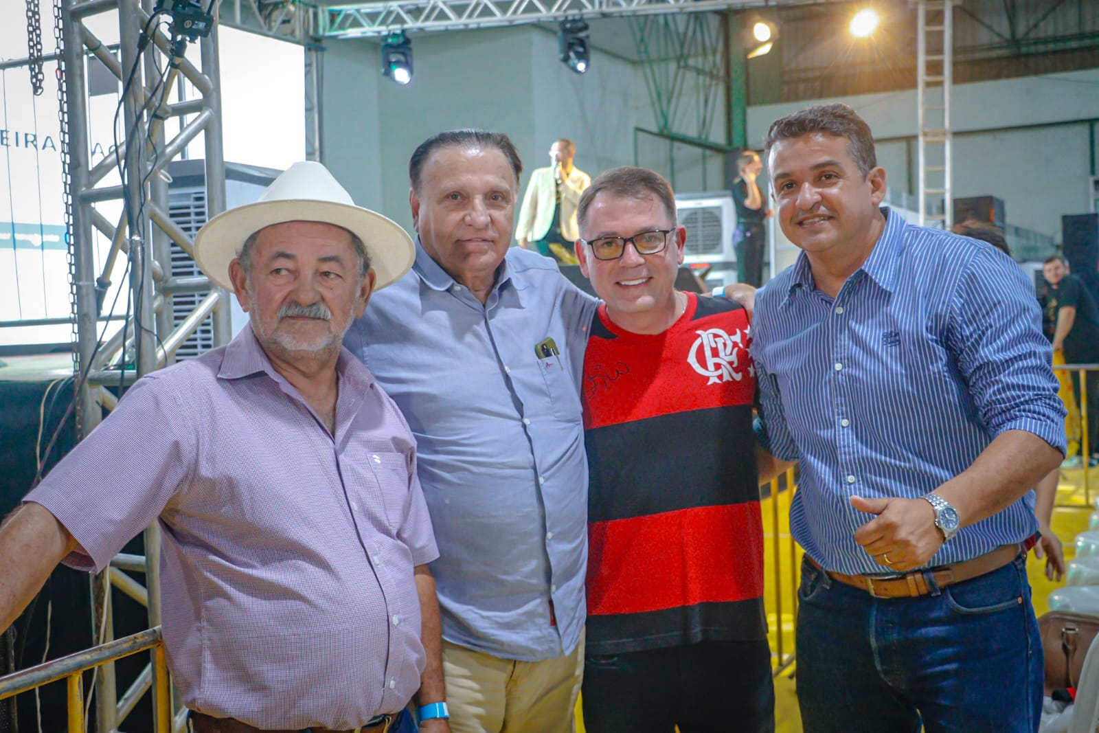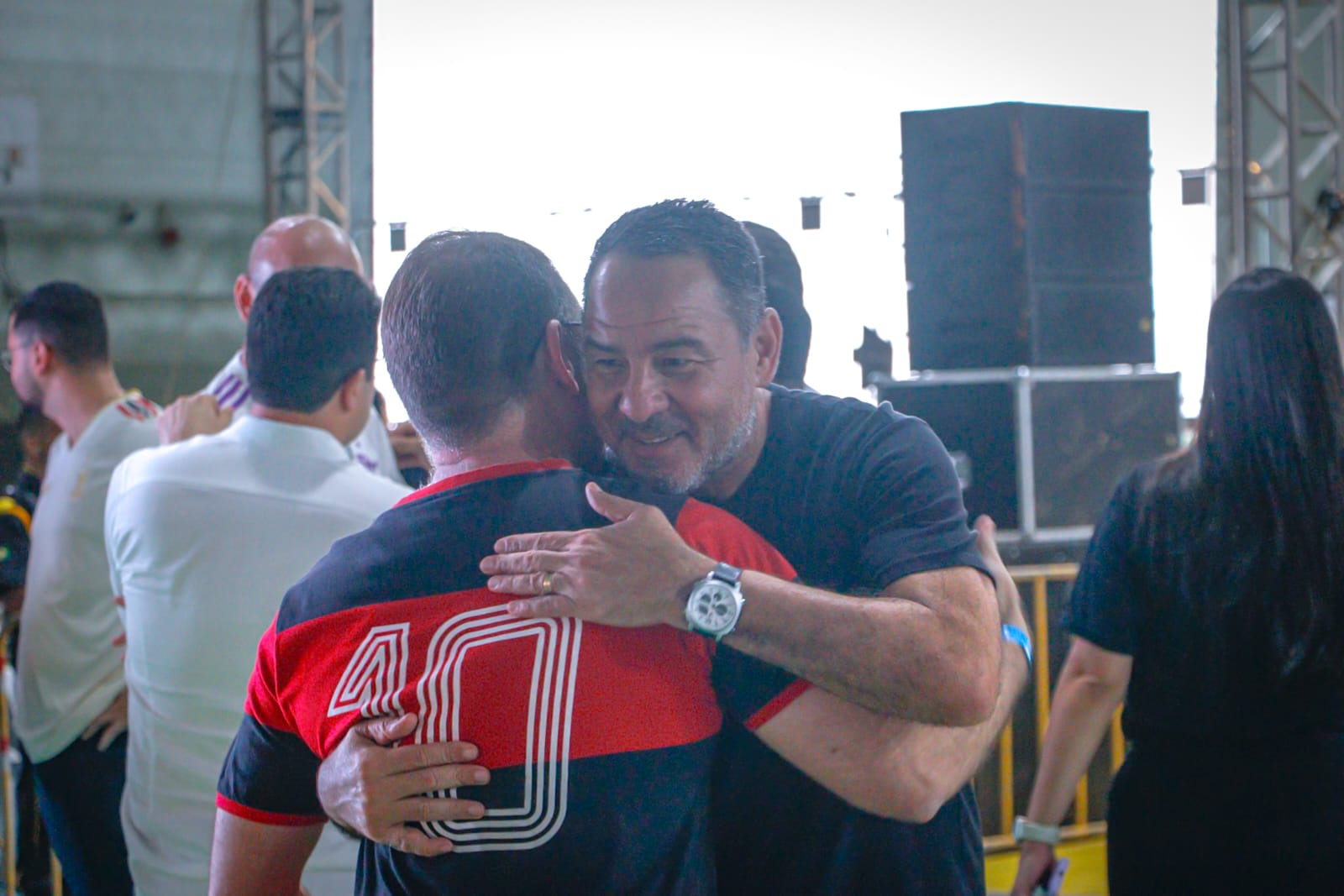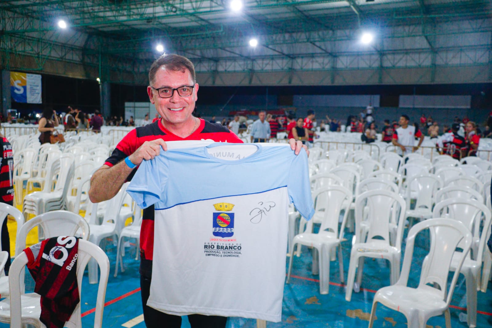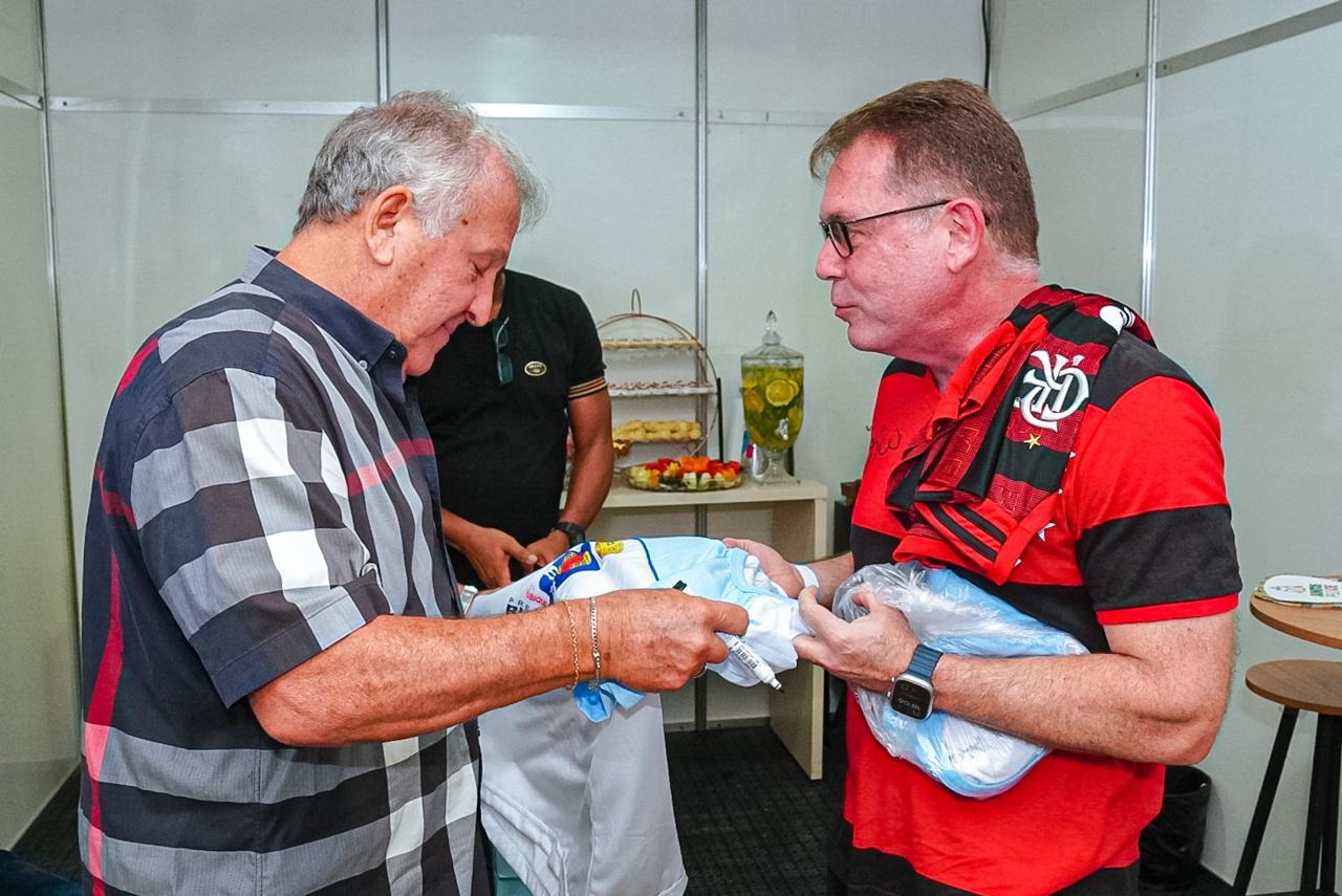 Trajando a camisa rubro-negra do clube de coração, o gestor municipal destacou a importância da presença do ex-jogador em solo acreano. (Foto: Marcos Araújo/Secom)