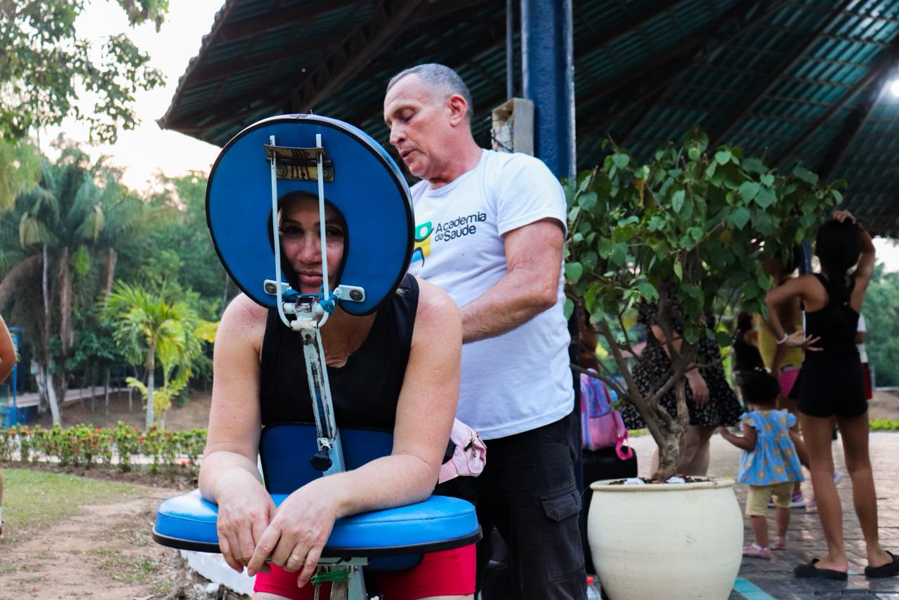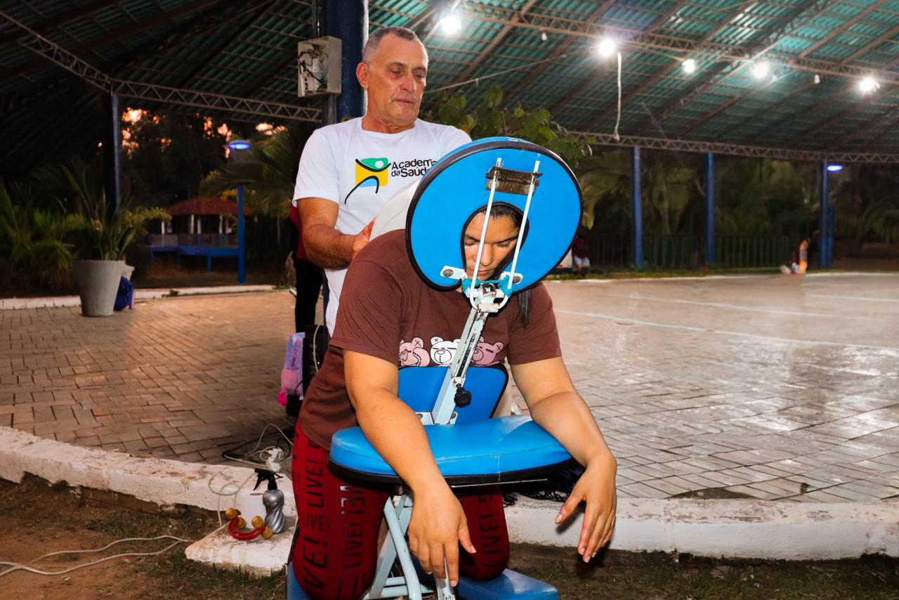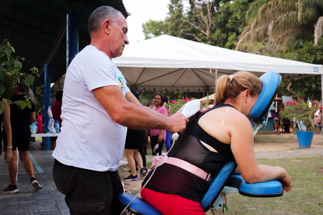 Além do aulão, a programação contou com diversos atendimentos gratuitos à comunidade, como auriculoterapia, massagens relaxantes, aferição de pressão arterial e orientações sobre saúde e bem-estar. (Foto: Vitória Souza/Secom)