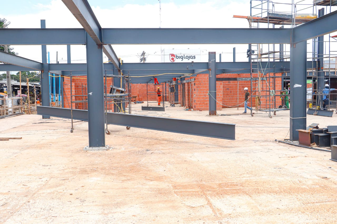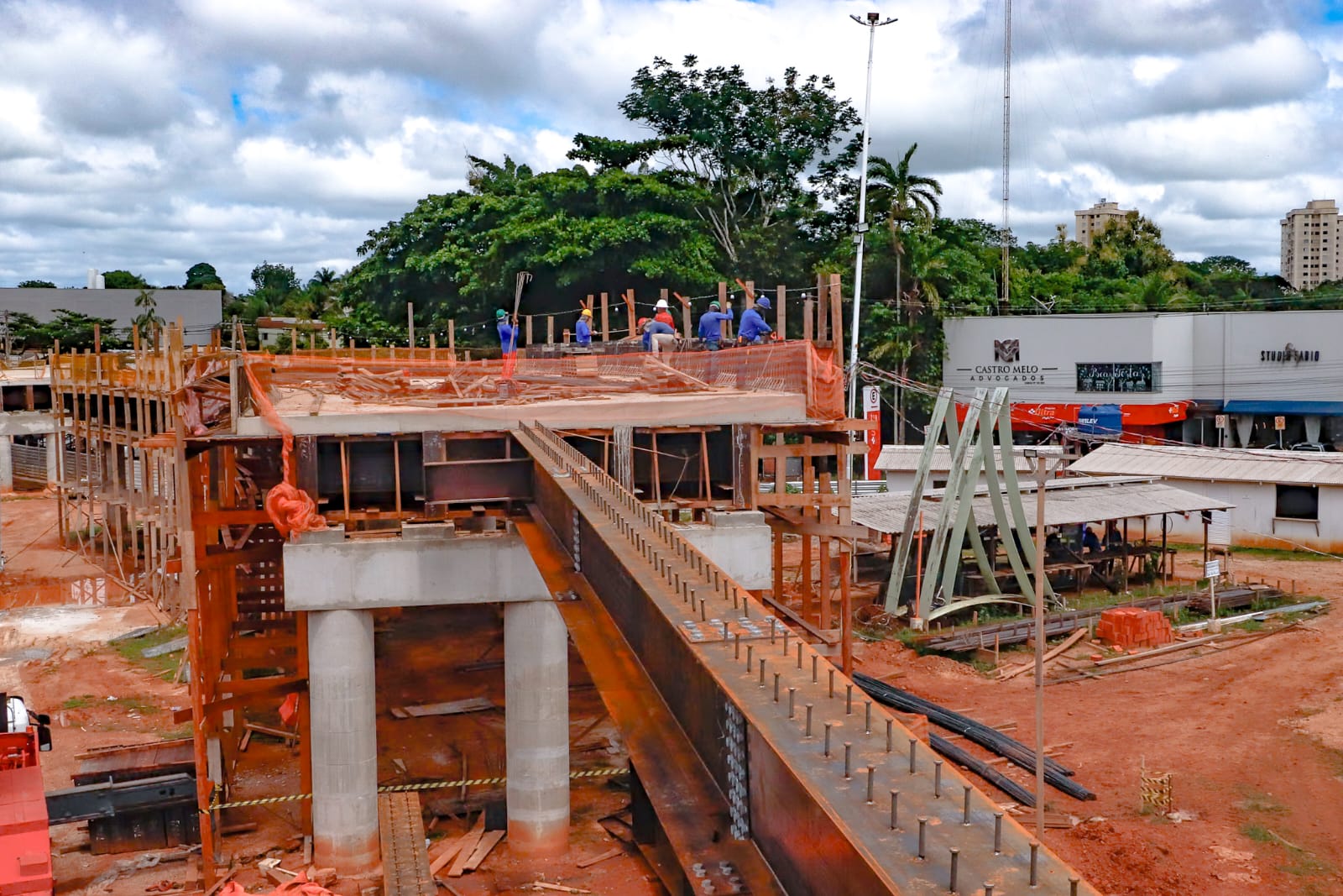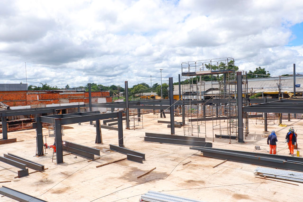 Novo Mercado Municipal já alcançou 50% de execução, enquanto o Elevado da AABB, com 278 metros de extensão, está praticamente 80% concluído. (Foto: Marcos Araújo/Secom)
