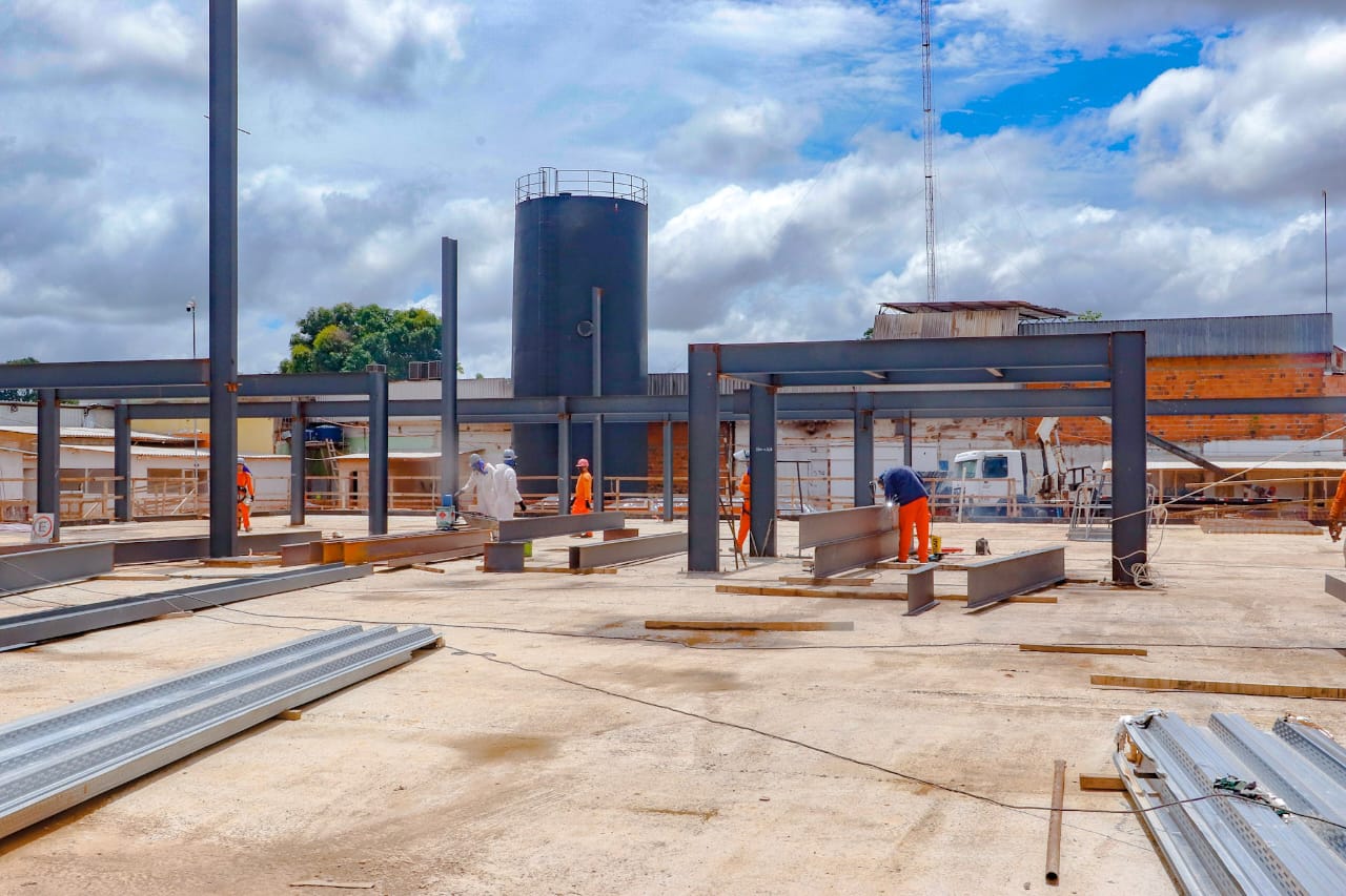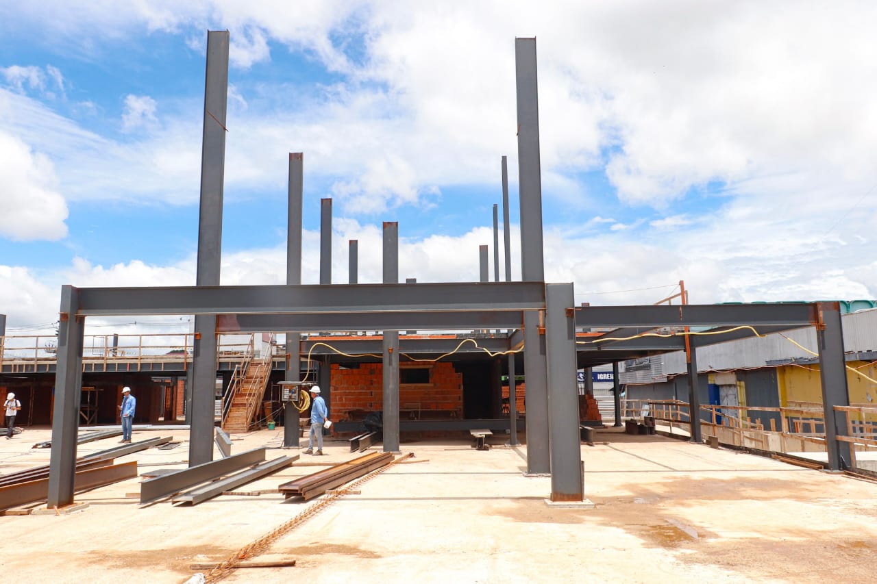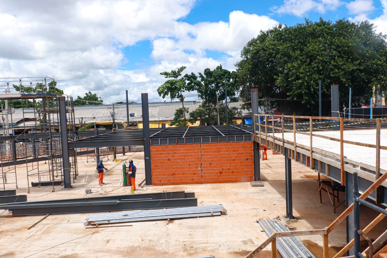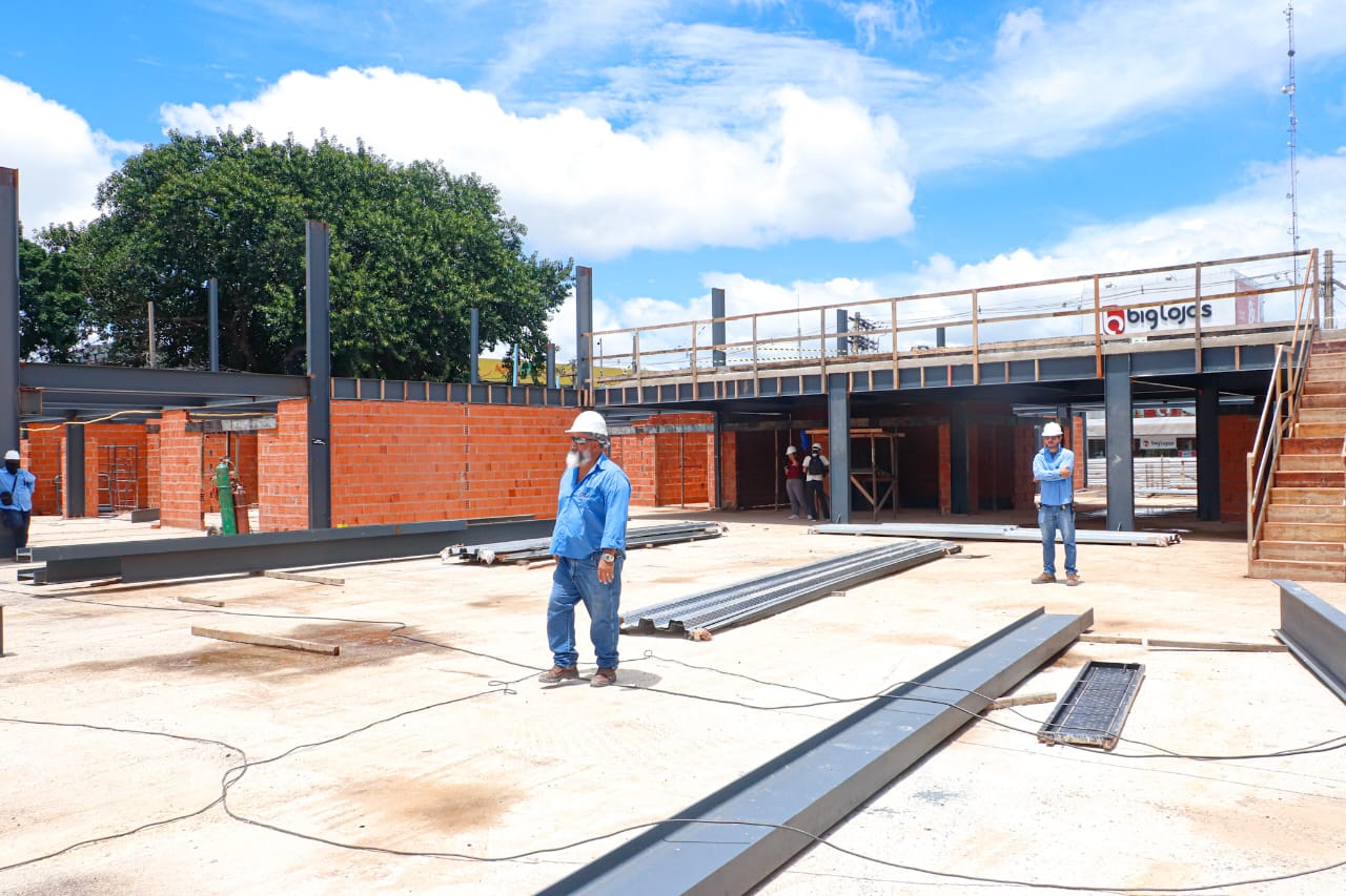 Novo Mercado Municipal já alcançou 50% de execução, enquanto o Elevado da AABB, com 278 metros de extensão, está praticamente 80% concluído. (Foto: Marcos Araújo/Secom)