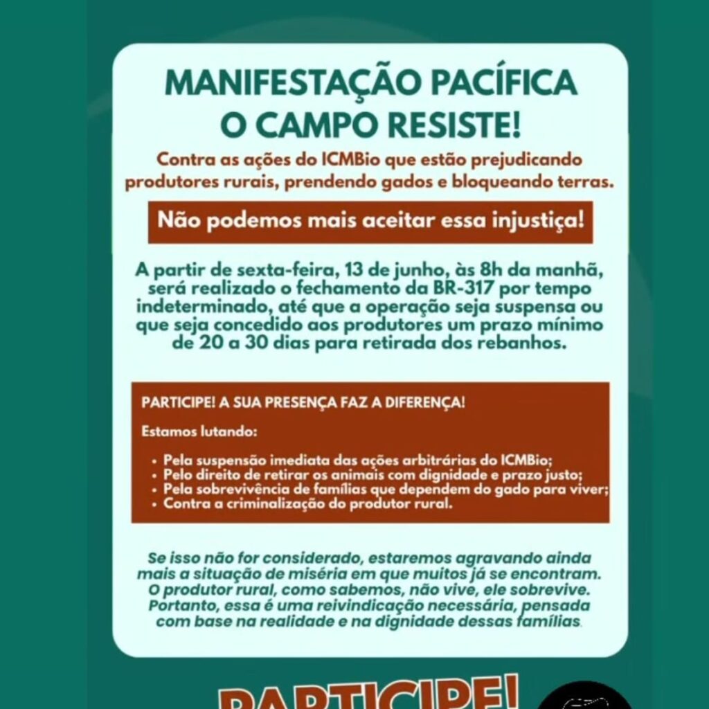 A manifestação está marcada para começar às 8h da manhã e pode manter a rodovia fechada por tempo indeterminado. Entre as exigências dos organizadores estão a suspensão imediata das operações, concessão de prazo de até 30 dias para retirada do gado, fim da criminalização dos produtores e respeito ao direito de sobrevivência das famílias que moram na Resex.