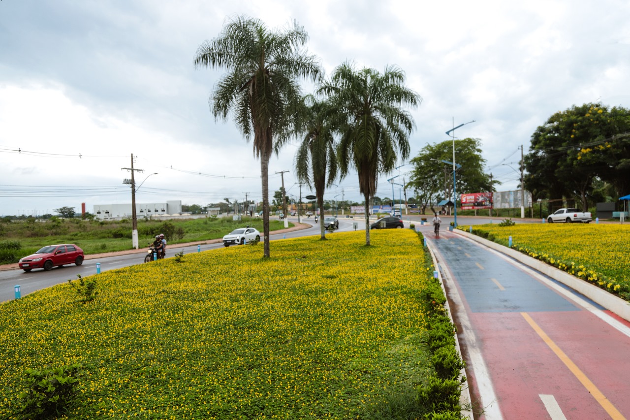 Os canteiros centrais da cidade embelezados pela florada dos amendoins forrageiros, se somam a bela arquitetura da via Chico Mendes, o que retrata uma cidade linda e moderna. (Foto: Val Fernandes/Secom)