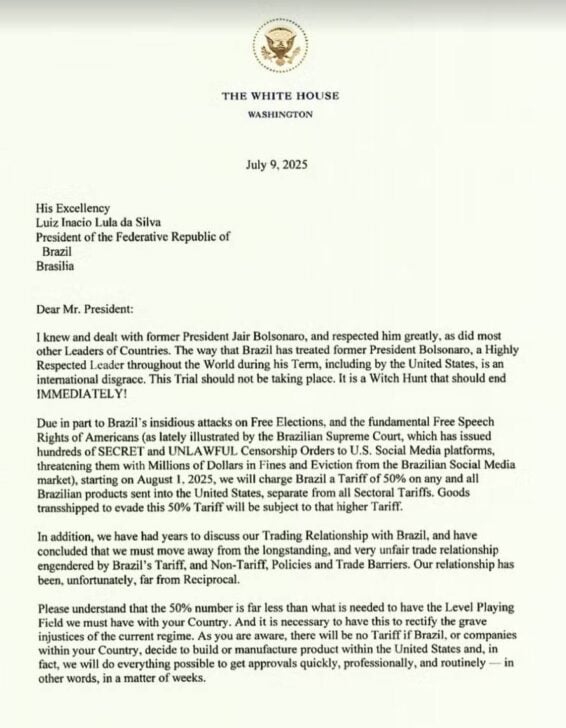 • Tarifa de 50% sobre todos os produtos brasileiros a partir de 1º de agosto.