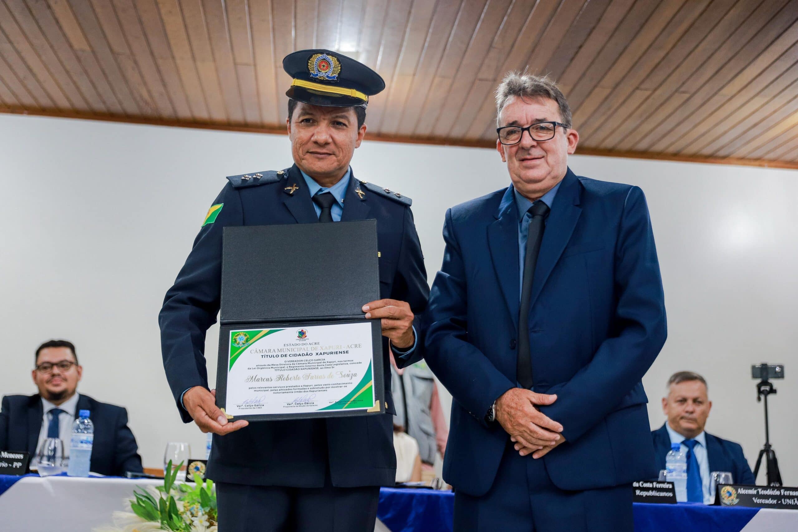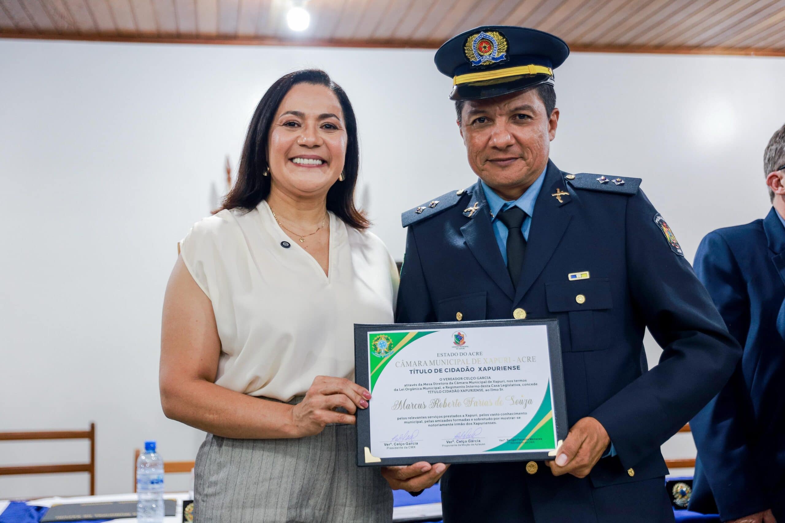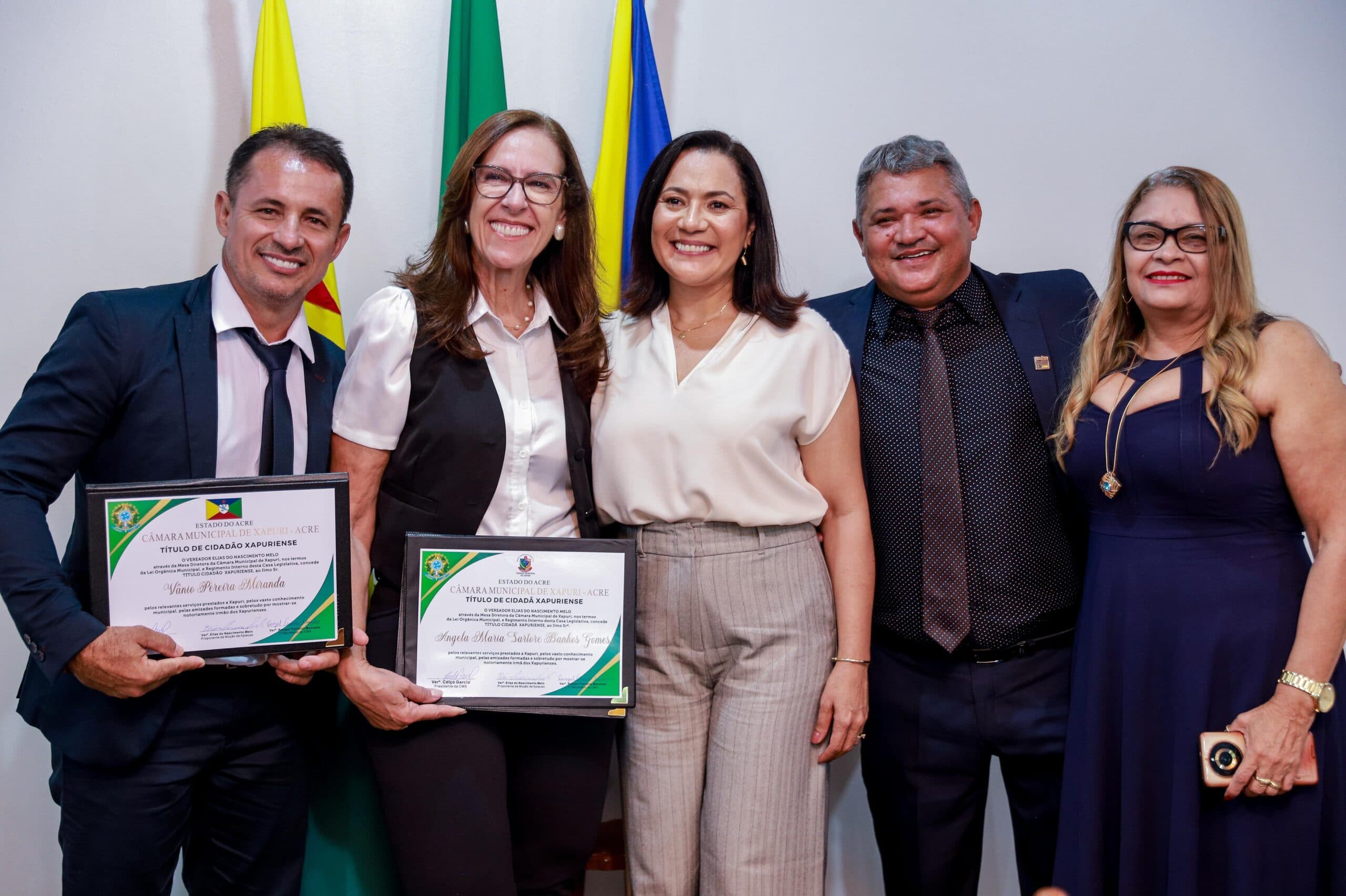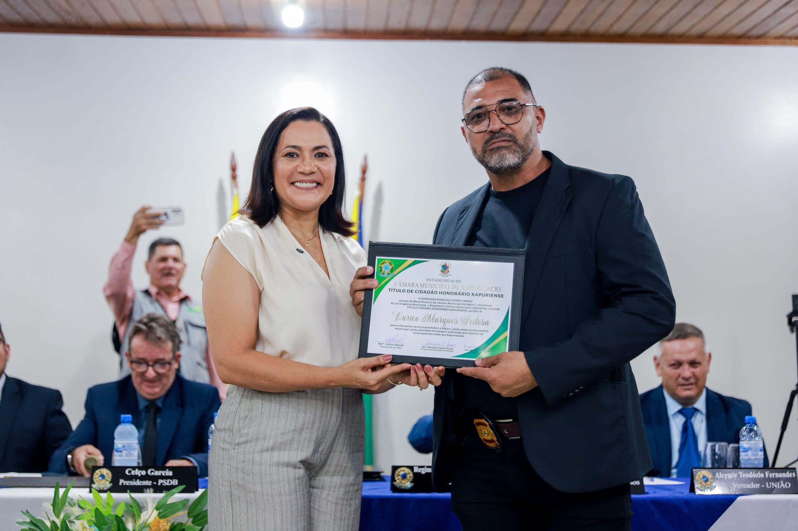 A vice-governadora e titular da Secretaria de Estado de Assistência Social e Direitos Humanos (SEASDH), Mailza Assis, recebeu na noite desta quinta-feira, 27, em sessão solene realizada pela Câmara Municipal na Escola Estadual Anthero Soares Brandão, em Xapuri, o título de Cidadã Xapuriense. A indicação foi feita pelo vereador Celso Garcia, o Paraná, e foi aprovada por unanimidade, celebrando o compromisso e a dedicação da vice-governadora à comunidade.