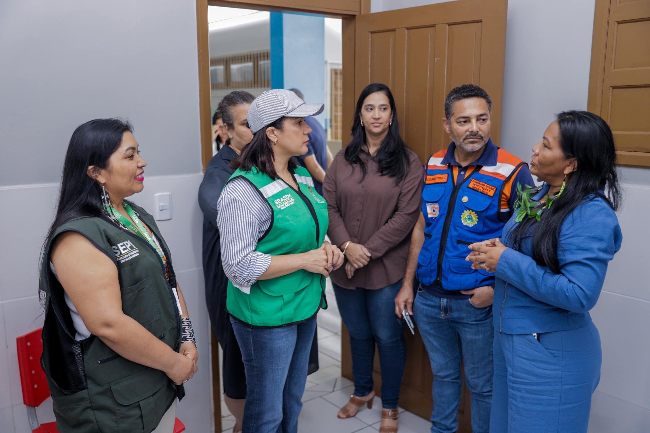 A vice-governadora e titular da pasta, Mailza Assis, acompanhada da titular da Secretaria Extraordinária de Povos Indígenas (Sepi), Francisca Arara, e do coordenador da Defesa Civil Estadual, Carlos Batista, visitou a unidade escolar nesta segunda-feira, 10, para conferir a situação dos indígenas que precisaram deixar suas casas.